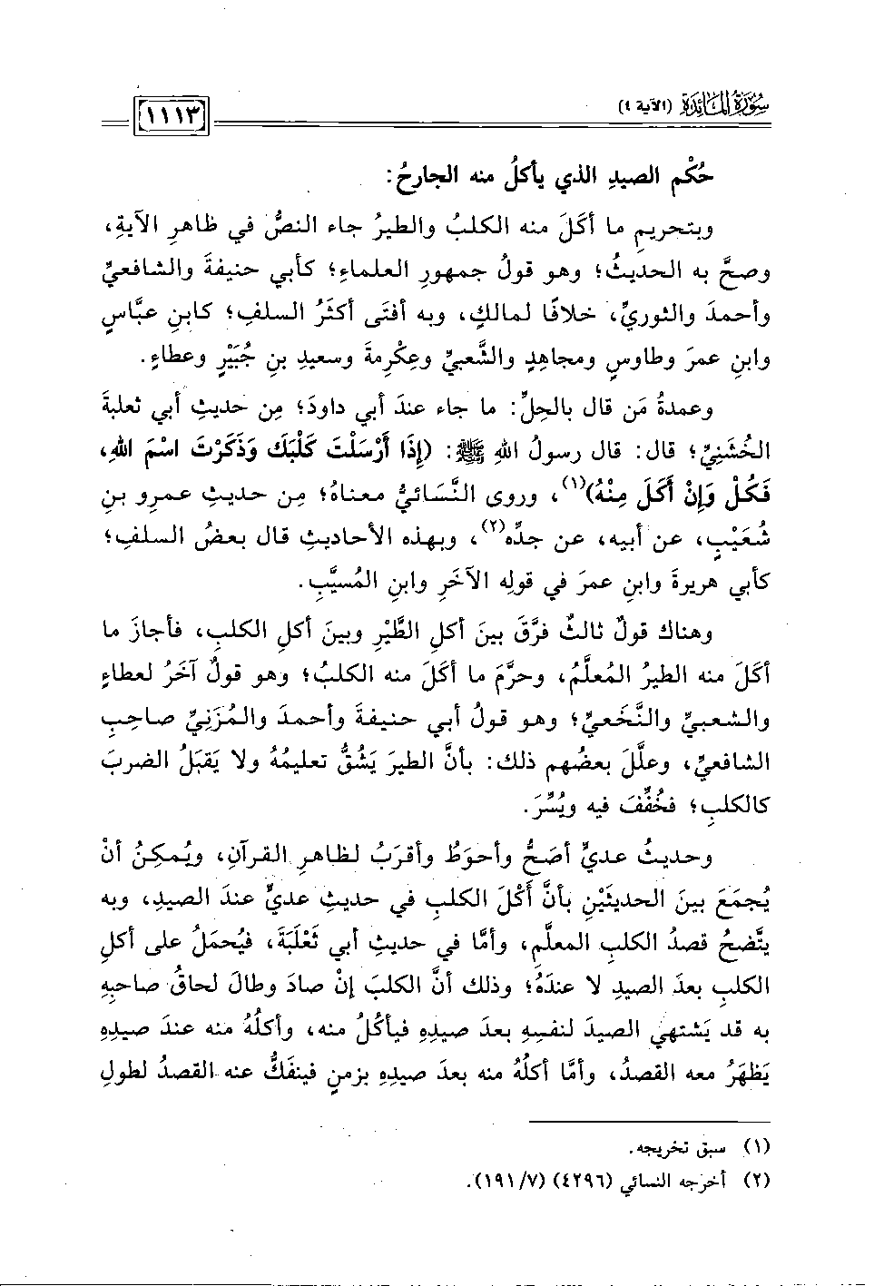 وبتحريمِ ما أكَل منه الكلبُ والطيرُ حاء النص في ظاهرِ الآية، وصح به الحديثُ! وهو قول جمهورِ العلماءِ؛ كأبي حنيفةَ والشافعي وأحمدَ والثوري، خلافًا لمالك، وبه أفتَى أكثَرُ السلفِ؛ كابنِ عباس وابنِ عمرَ وطاوس ومجاهِدٍ والشَّعبي وعِكرِمةَ وسعيدِ بنِ جُبَيرٍ وعطاء.