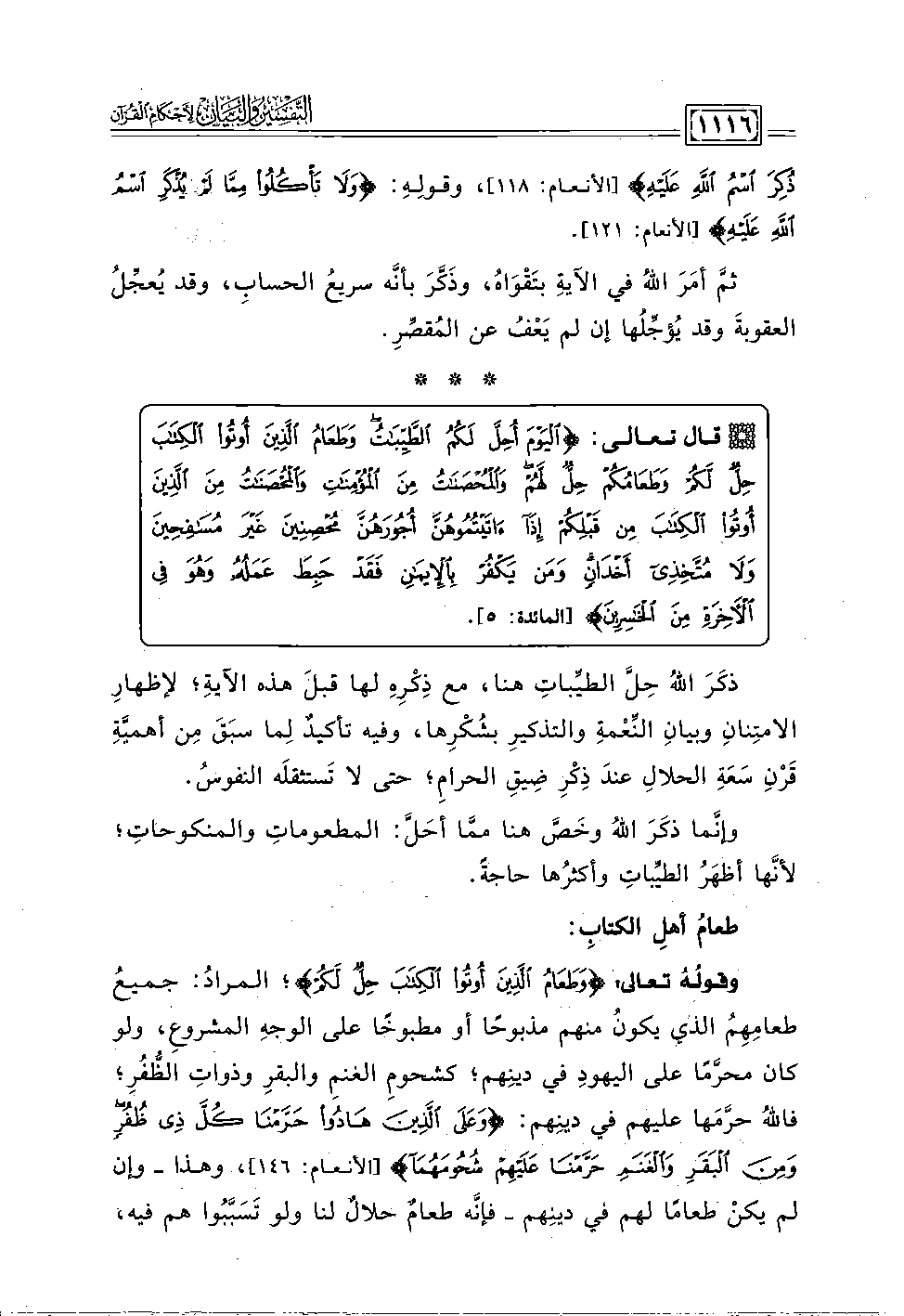 وقوله تعالى: {وَطَعَامُ الَّذِينَ أُوتُوا الْكِتَابَ حِلٌّ لَكُمْ}؛ المرادُ: جميعُ طعامِهِم الذي يكونُ منهم مذبوحا أو مطبوخا على الوجهِ المشروع، ولو كان محرمًا على اليهودِ في دينِهم؛ كشحومِ الغنم والبقرِ وذواتِ الظُّفُرِ؛ فاللهُ حرَّمَها عليهم في دينهم: {وَعَلَى الَّذِينَ هَادُوا حَرَّمْنَا كُلَّ ذِي ظُفُرٍ وَمِنَ الْبَقَرِ وَالْغَنَمِ حَرَّمْنَا عَلَيْهِمْ شُحُومَهُمَا} [الأنعام: ١٤٦]، وهذا -وإن لم يكنْ طعاما لهم في دينهم- فإنه طعام حلالٌ لنا ولو تَسَبَّبُوا هم فيه،