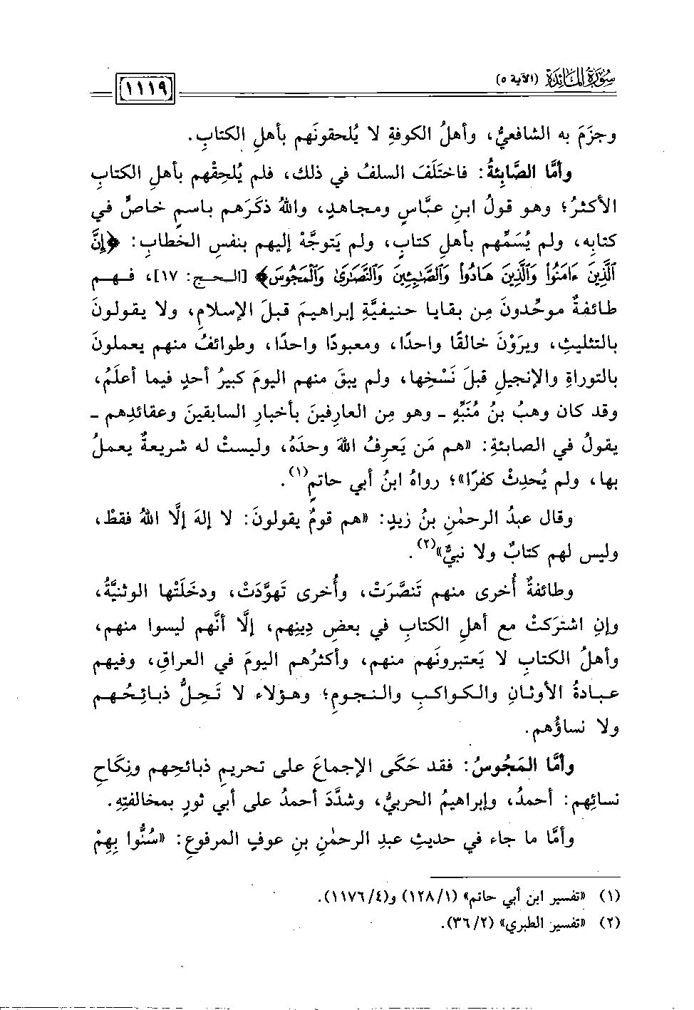 وأمَّا الصَّابِئةُ: فاختلَفَ السلف في ذلك، فلم يُلحِقهم بأهلِ الكتابِ الأكثرُ؛ وهو قولُ ابنِ عبَّاسٍ ومجاهدٍ، واللهُ ذكَرَهم باسمِ خاص في كتابِه، ولم يُسَمِّهم بأهلِ كتاب، ولم يَتوجهْ إليهم بنفسِ الخطاب: {إِنَّ الَّذِينَ آمَنُوا وَالَّذِينَ هَادُوا وَالصَّابِئِينَ وَالنَّصَارَى وَالْمَجُوسَ} [الحج: ١٧]، فهم طائفة موحِّدونَ من بقايا حنيفيةِ إبراهيمَ قبلَ الإسلام، ولا يقولونَ بالتثليث، ويرَونَ خالقا واحدا، ومعبودا واحدا، وطوائفُ منهم يعملونَ بالتوراةِ والإنجيلِ قبلَ نَسخِها، ولم يبقَ منهم اليومَ كبيرُ أحدٍ فيما أعلَم، وقد كان وهب بن منَبِّهٍ -وهو مِن العارِفينَ بأخبارِ السابقينَ وعقائدِهم- يقول في الصابئةِ: "هم مَن يَعرِف اللهَ وحدَه، وليستْ له شريعة يعملُ بها، ولم يُحدِث كفرًا"؛ رواهُ ابنُ أبي حاتمٍ (١).