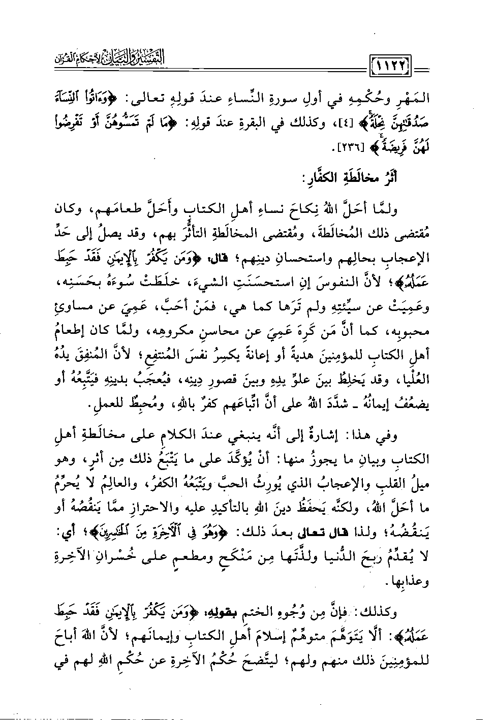 وكذلك: فإن مِن وُجوهِ الختمِ بقولهِ: {وَمَنْ يَكْفُرْ بِالْإِيمَانِ فَقَدْ حَبِطَ عَمَلُهُ}: ألا يَتَوَهمَ متوهم إسلامَ أهلِ الكتابِ وإيمانَهم؛ لأن اللهَ أباحَ للمؤمِنِينَ ذلك منهم ولهم؛ ليتضحَ حكمُ الآخرةِ عن حُكْمِ اللهِ لهم في