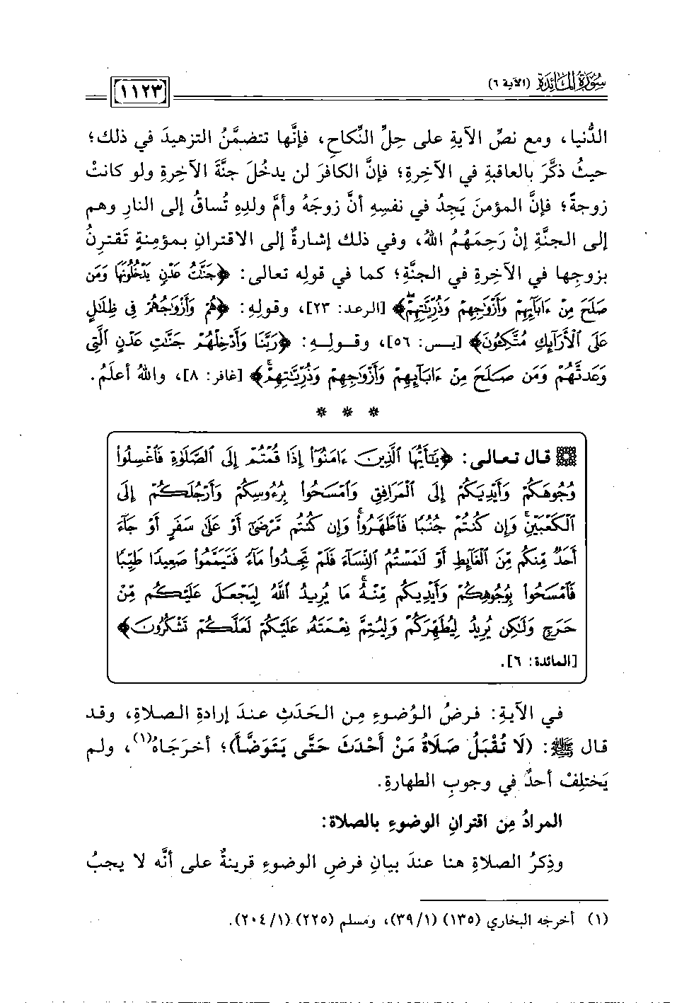 قال تعالى: {يَاأَيُّهَا الَّذِينَ آمَنُوا إِذَا قُمْتُمْ إِلَى الصَّلَاةِ فَاغْسِلُوا وُجُوهَكُمْ وَأَيْدِيَكُمْ إِلَى الْمَرَافِقِ وَامْسَحُوا بِرُءُوسِكُمْ وَأَرْجُلَكُمْ إِلَى الْكَعْبَيْنِ وَإِنْ كُنْتُمْ جُنُبًا فَاطَّهَّرُوا وَإِنْ كُنْتُمْ مَرْضَى أَو عَلَى سَفَرٍ أَو جَاءَ أَحَدٌ مِنْكُمْ مِنَ الْغَائِطِ أَو لَامَسْتُمُ النِّسَاءَ فَلَمْ تَجِدُوا مَاءً فَتَيَمَّمُوا صَعِيدًا طَيِّبًا فَامْسَحُوا بِوُجُوهِكُمْ وَأَيْدِيكُمْ مِنْهُ مَا يُرِيدُ اللَّهُ لِيَجْعَلَ عَلَيْكُمْ مِنْ حَرَجٍ وَلَكِنْ يُرِيدُ لِيُطَهِّرَكُمْ وَلِيُتِمَّ نِعْمَتَهُ عَلَيْكُمْ لَعَلَّكُمْ تَشْكُرُونَ (٦)} [المائدة: ٦].