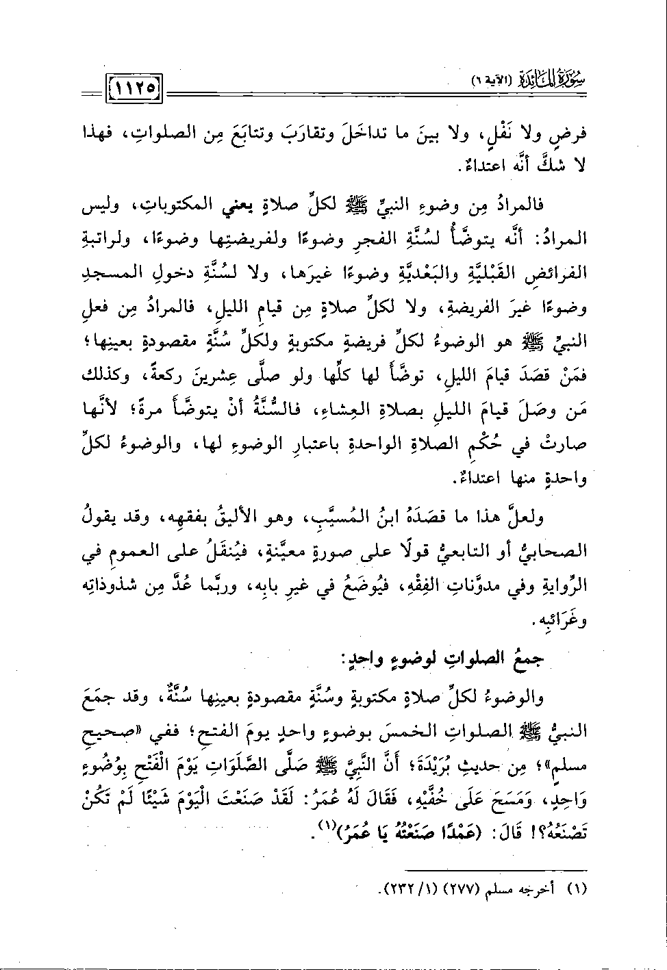 والوضوء لكلِّ صلاةٍ مكتوبة وسُنَّةٍ مقصودةٍ بعينِها سُنَّة، وقد جمعَ النبي - صلى الله عليه وسلم - الصلواتِ الخمس بوضوءٍ واحد يومَ الفتحِ؛ ففي "صحيحِ مسلم"؛ مِن حديثِ بُرَيدَةَ؛ أنَّ النبِي - صلى الله عليه وسلم - صَلى الصلَوَاتِ يَومَ الفَتحِ بِوضوءِ وَاحد، وَمسحَ عَلَى خُفيه، فَقالَ لَه عُمَرُ: لَقَد صَنَعتَ الْيَومَ شيئا لَم تَكُنْ تَصنَعهُ؟ ! قَالَ: (عَمدا صَنَعتهُ يَا عُمَرُ) (١).