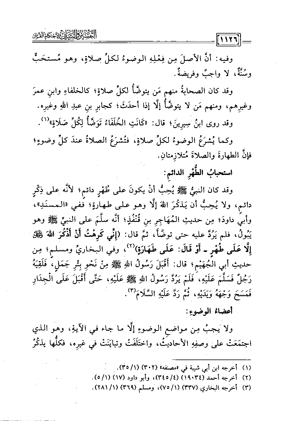 وقد كان النبيُّ - صلى الله عليه وسلم - يحبُّ أن يكونَ على طهر دائم؛ لأنه على ذِكرٍ دائمٍ، ولا يحِب أن يذكُرَ اللهَ إلا وهو على طهارة؛ ففي "المسنَدِ"، وأبي داودَ؛ مِن حديثِ المُهَاجِرِ بنِ قنفذ؛ أنه سلم على النبيِّ - صلى الله عليه وسلم - وهو يَبول، فلم يَرُدَّ عليه حتى توضَّأ، ثم قال: (إني كَرِهتُ أن أذْكُرَ اللهَ -عز وجل - إِلا عَلَى طُهْرٍ - أو قَالَ: عَلَى طَهَارة) (٢)، وفي البخاري ومسلم؛ مِن حديثِ أبي الجُهيم؛ قال: أقبَلَ رَسُول اللهِ - صلى الله عليه وسلم - مِن نَحوِ بئر جَمَلٍ، فَلَقِيَهُ رَجُل فَسَلَّمَ عَلَيه، فَلَم يَرُدَّ رَسُولُ اللهِ - صلى الله عليه وسلم - عَلَيه، حَتَّى أَقبلَ عَلَى الجدَارِ فَمَسَحَ وَجهَه وَيَدَيه، ثم رَد عَلَيهِ السَّلَامَ (٣).