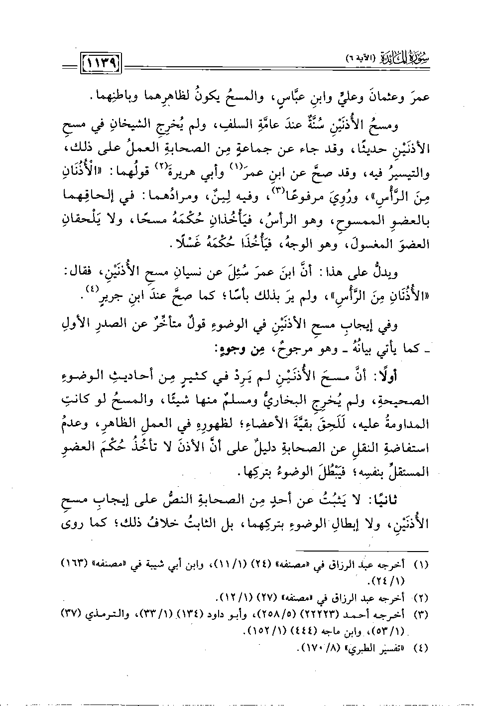 وفي إيجابِ مسحِ الأذنَينِ في الوضوءِ قول متأخِّر عن الصدرِ الأولِ -كما يأتي بيانُهُ- وهو مرجوح، من وجوه: