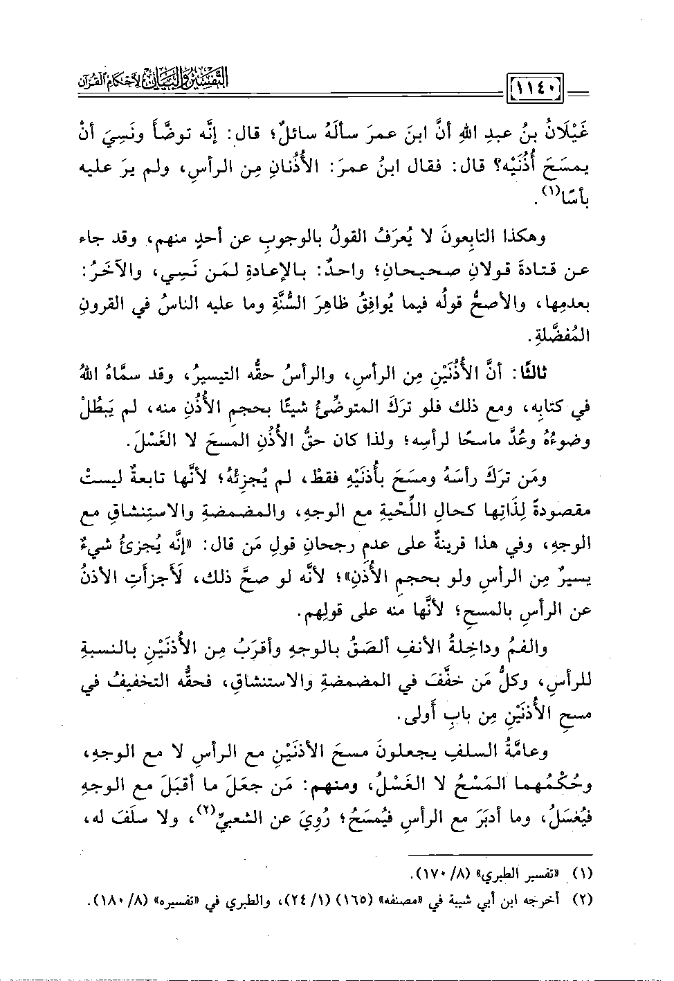 وعامةُ السلفِ يجعلونَ مسحَ الأذنَينِ مع الرأس لا مع الوجه، وحُكمهما المَسح لا الغَسل، ومنهم: مَن جعَلَ ما أقبَلَ مع الوجهِ فيُغسَل، وما أدبَرَ مع الرأسِ فيمسحُ؛ رُوِيَ عن الشعبي (٢)، ولا سلَفَ له،