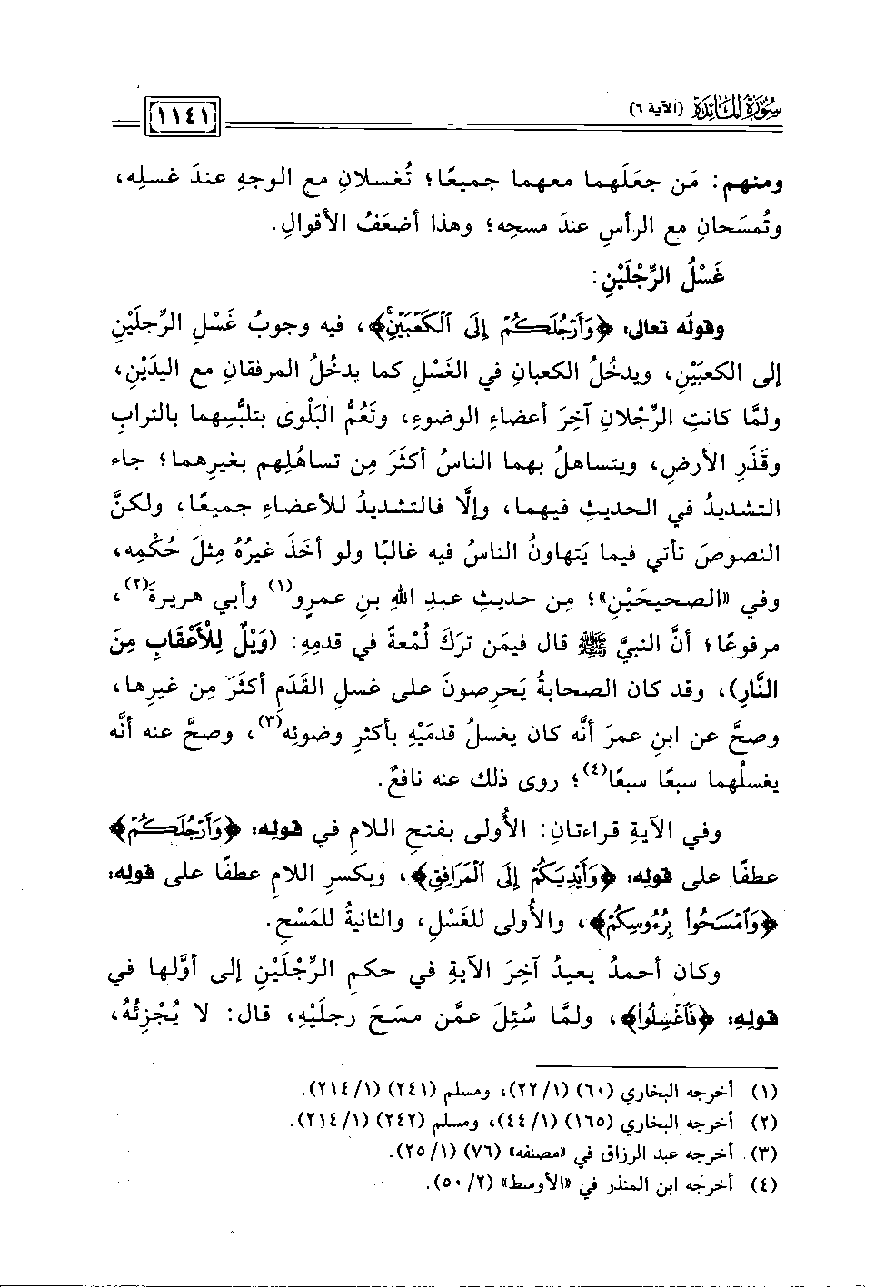 وقوله تعالى: {وَأَرْجُلَكُمْ إِلَى الْكَعْبَيْنِ}، فيه وجوبُ غَسلِ الرجلَينِ إلى الكعبَين، ويدخُلُ الكعبانِ في الغَسْلِ كما يدخلُ المرفقان مع اليدَين، ولما كانتِ الرجلانِ آخِرَ أعضاءِ الوضوء، وتَعُم البلوى بتلبسهما بالترابِ وقَذَرِ الأرض، ويتساهلُ بهما الناسُ أكثَرَ مِن تساهُلِهم بغيرِهما؛ جاء التشديد في الحديث فيهما، وإلا فالتشديدُ للأعضاءِ جميعا، ولكن النصوصَ تأتي فيما يَتهاونُ الناس فيه غالبا ولو أخَذَ غيرُهُ مِثلَ حُكمِه، وفي "الصحيحَينِ"؛ مِن حديثِ عبد اللهِ بن عمرو (١) وأبي هريرةَ (٢)، مرفوعا؛ أن النبي - صلى الله عليه وسلم - قال فيمَن ترَكَ لُمْعةً في قدمِهِ: (وَيل لِلأعقابِ مِنَ النارِ)، وقد كان الصحابةُ يَحرِصونَ على غسلِ القَدَم أكثَرَ مِن غيرِها، وصح عن ابنِ عمرَ أنه كان يغسلُ قدميهِ بأكثرِ وضوئه (٣)، وصح عنه أنه يغسلهما سبعًا سبعًا (٤)؛ روى ذلك عنه نافع.
