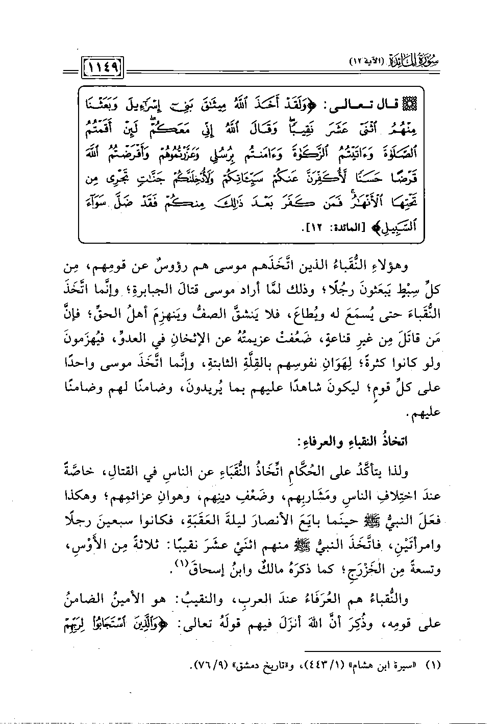 وهؤلاءِ النقَباءُ الذين اتَّخَذَهم موسى هم رؤوس عن قومِهم، مِن كل سِبط يَبعَثونَ رجُلا؛ وذلك لمَّا أراد موسى قتالَ الجبابرة، وإنما اتخذَ النقَباءَ حتى يسمَعَ له ويطاعَ، فلا يَنشقَّ الصف ويَنهزمَ أهل الحق؛ فإن مَن قاتَلَ مِن غيرِ قناعة، ضَعُفت عزيمتُه عن الإثخانِ في العدو، فيُهزَمونَ ولو كانوا كثرةَ، لِهَوَانِ نفوسِهم بالقِلةِ الثابتة، وإنما اتخَذَ موسى واحدًا على كل قوم؛ ليكونَ شاهدًا عليهم بما يريدونَ، وضامنا لهم وضامنا عليهم.