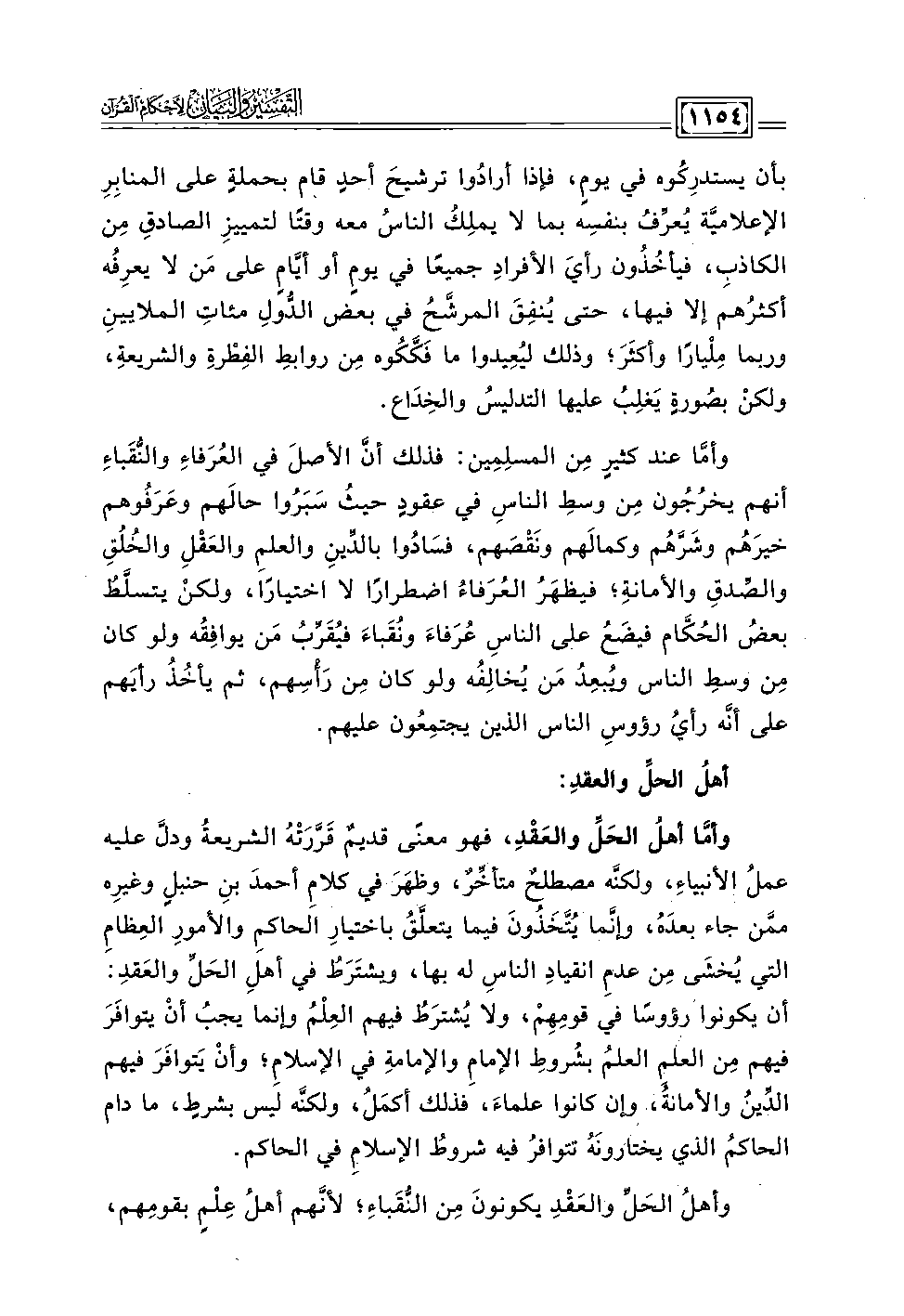 وأمَّا أهلُ الحَلِّ والعَقْدِ، فهو معنًى قديمٌ قَرَّرَتْهُ الشريعةُ ودلَّ عليه عملُ الأنبياء، ولكنَّه مصطلحٌ متأخِّرٌ، وظهَرَ في كلامِ أحمدَ بنِ حنبلٍ وغيرِه ممَّن جاء بعدَهُ، وإنَّما يُتَّخَذُونَ فيما يتعلَّقُ باختيارِ الحاكمِ والأُمورِ العِظامِ التي يُخشَى مِن عدمِ انقيادِ الناسِ له بها، ويشتَرَطُ لي أهلِ الحَلِّ والعَقدِ: أن يكونوا رؤوسًا في قومِهِمْ، ولا يُشترَطُ فيهم العِلْمُ وإنما يجبُ أنْ يتوافَرَ فيهم مِن العلم العلمُ بشُروطِ الإمامِ والإمامةِ في الإسلامِ؛ وأنْ يَتوافَرَ فيهم الدِّين والأمانةُ، وإن كانوا علماءَ، فذلك أكمَلُ، ولكنَّه ليس بشرطٍ، ما دام الحاكمُ الذي يختارونَهُ تتوافرُ فيه شروطُ الإسلامِ في الحاكم.