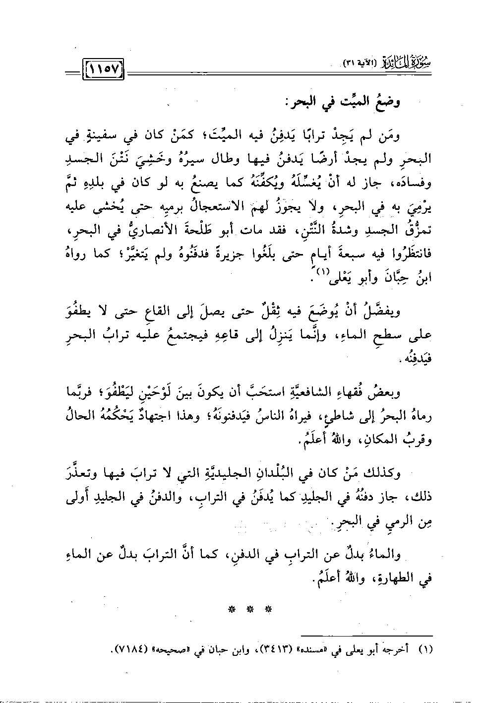 ومَن لم يَجِدْ ترابًا يَدفِنُ فيه الميِّتَ؛ كمَنْ كان في سفينةِ في البحرِ ولم يجدْ أرضًا يَدفنُ فيها وطال سيرُهُ وخَشِيَ نَتْنَ الجسدِ وفسادَه، جاز له أنْ يُغسِّلَهُ ويُكفِّنَهُ كما يصنعُ به لو كان في بلدِهِ ثُمَّ يرْمِيَ به في البحر، ولا يجوزُ لهم الاستعجالُ برميه حتى يُخشى عليه تمزُّقُ الجسدِ وشدةُ النَّتْن، فقد مات أبو طَلْحةَ الأَنصاريُّ في البحر، فانتظَرُوا فيه سبعةَ أيامٍ حتى بلَغُوا جزيرةً فدفَنُوهُ ولم يَتغيَّرْ؛ كما رواهُ ابنُ حِبَّانَ وأبو يَعْلى (١).