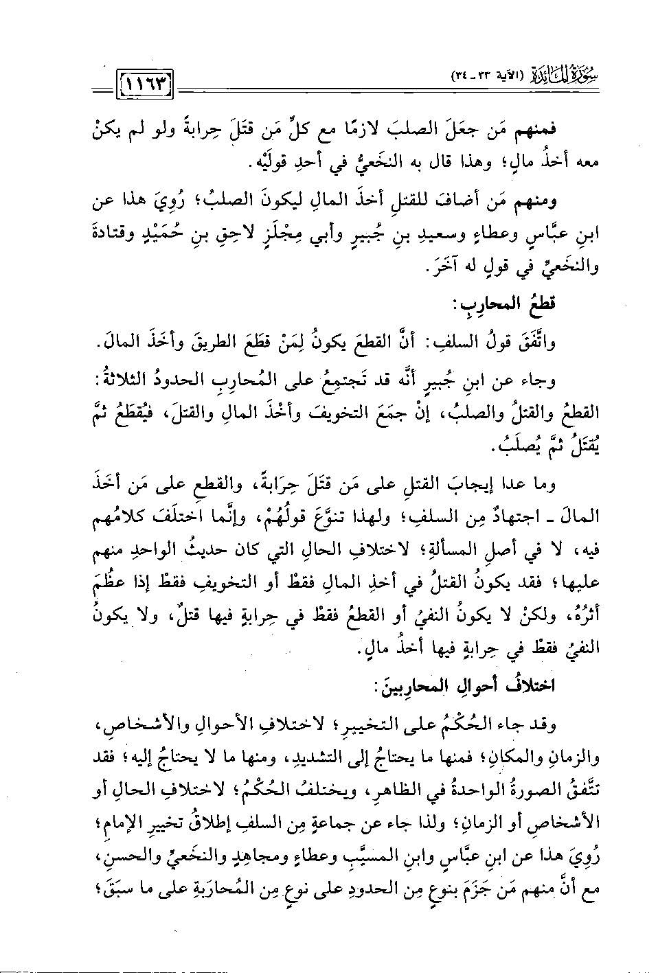 وما عدا إيجابَ القتلِ على مَن قتَلَ حِرَابةً، والقطعِ على مَن أخَذَ المالَ -اجتهادٌ من السلفِ؛ ولهذا تنوَّعَ قولُهُمْ، وإنَّما اختلَفَ كلامُهم فيه، لا في أصلِ المسألةِ؛ لاختلافِ الحالِ التي كان حديثُ الواحدِ منهم عليها؛ فقد يكونُ القتلُ في أخذِ المالِ فقطْ أو التخويفِ فقطْ إذا عظُمَ أثرُهُ، ولكنْ لا يكونُ النفيُ أو القطعُ فقطْ في حِرابةٍ فيها قتلٌ، ولا يكون النفيُ فقطْ في حِرابةٍ فيها أخذُ مالٍ.
