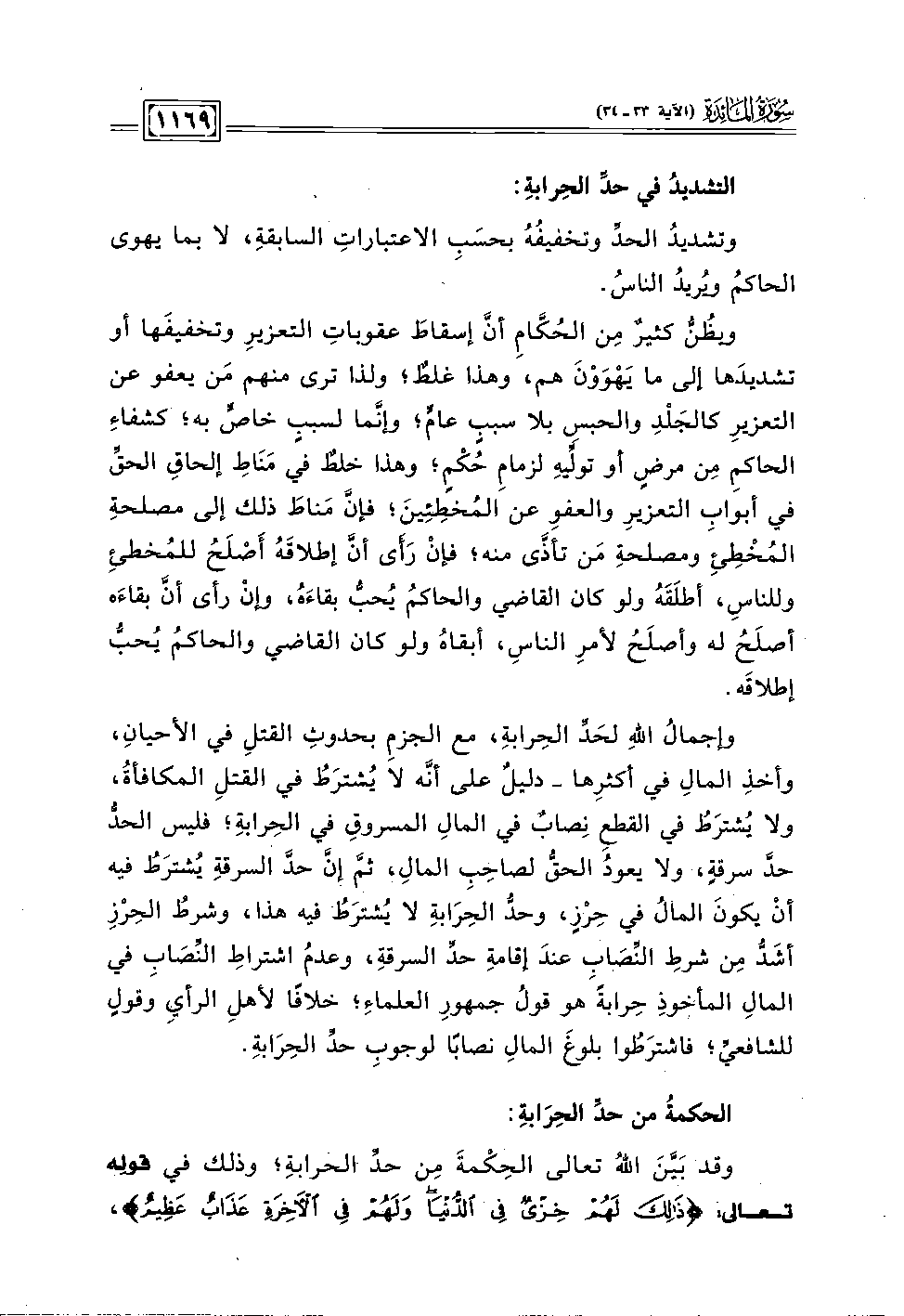 وإجمالُ الله لحَدِّ الحِرابة، مع الجزمِ بحدوثِ القتلِ في الأحيان، وأخذِ المالِ في أكثرِها -دليلٌ على أنه لا يُشترَطُ في القتلِ المكافأةُ، ولا يُشترَطُ في القطعِ نِصابٌ في المالِ المسروقِ في الحِرابةِ؛ فليس الحدُّ حدَّ سرقةٍ، ولا يعودُ الحقُّ لصاحِبِ المال، ثم إنَّ حدَّ السرقةِ يُشترَطُ فيه أنْ يكونَ المالُ في حِرْزٍ، وحدُّ الحِرَابةِ لا يُشترَطُ فيه هذا، وشرطُ الحِرْزِ أشَدُّ مِن شرطِ النِّصَابِ عندَ إقامةِ حدِّ السرقة، وعدمُ اشتراطِ النِّصَابِ في المالِ المأخوذِ حِرابةً هو قولُ جمهورِ العلماءِ؛ خلافًا لأهلِ الرأي وقولٍ للشافعيِّ؛ فاشترَطُوا بلوغَ المالِ نصابًا لوجوبِ حدِّ الحِرَابةِ.
