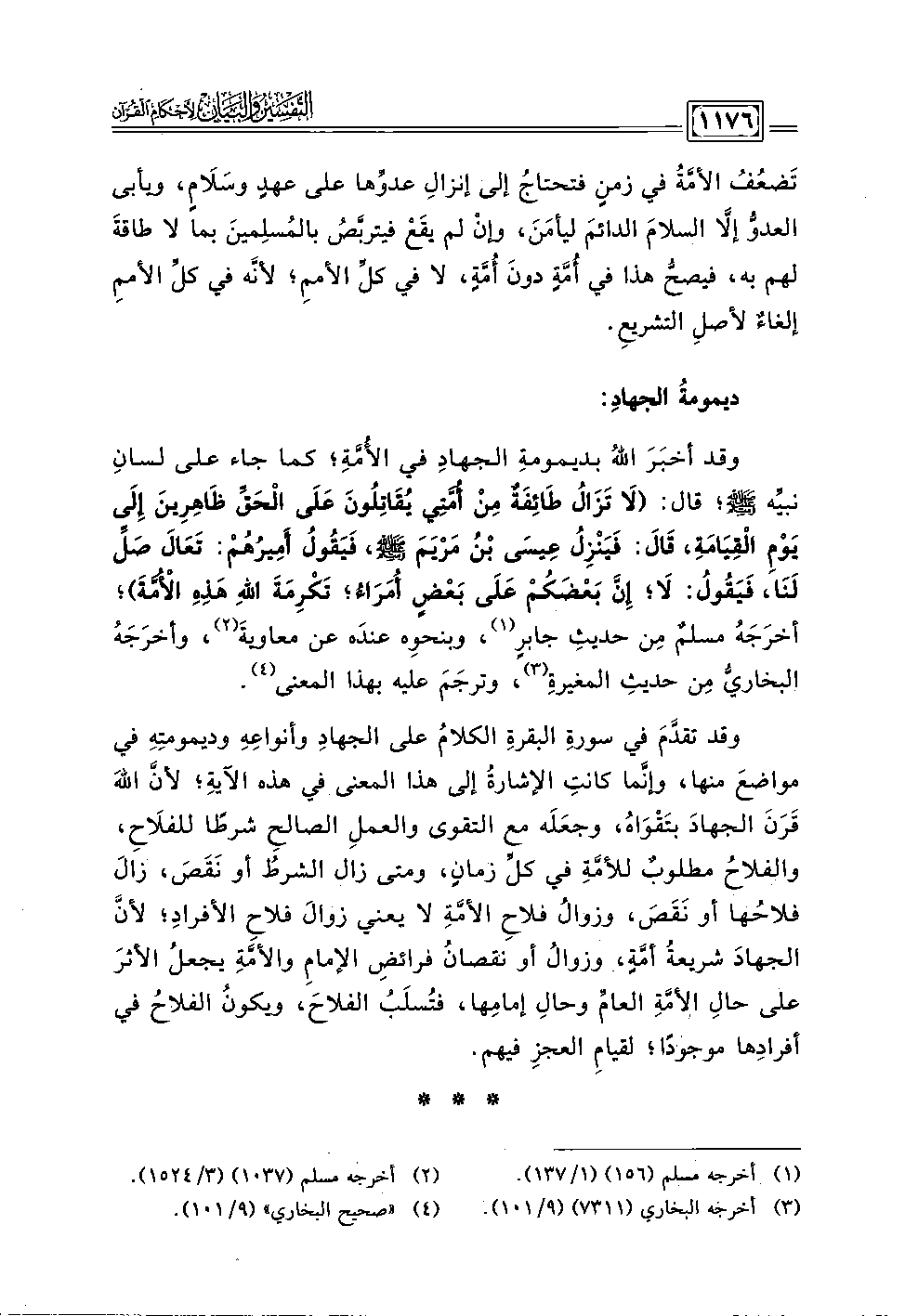 وقد أخبَرَ اللهُ بديمومةِ الجهادِ في الأُمَّةِ؛ كما جاء على لسانِ نبيِّه - صلى الله عليه وسلم -؛ قال: (لَا تَزَالُ طَائِفَةٌ مِنْ أُمِّتِي يُقَاتِلُونَ عَلَى الحَقِّ ظَاهِرينَ إلى يَوْمِ الْقِيَامَة، قَالَ: فَيَنْزِلُ عِيسَى بْنُ مَرْيَمَ - صلى الله عليه وسلم -، فَيَقُولُ أَمِيرُهُمْ: تَعَالَ صَلِّ لَنَا، فيَقُولُ: لَا؛ إِنَّ بَعْضَكُمْ عَلَى بَعْضٍ أُمَرَاءُ، تَكْرِمَةَ اللهِ هَذِهِ الأُمَّةَ)؛ أخرَجَهُ مسلمٌ من حديثِ جابرٍ (١)، وبنحوِه عندَه عن معاويةَ (٢)، وأخرَجَهُ البخاريُّ مِن حديثِ المغيرةِ (٣)، وترجَمَ عليه بهذا المعنى (٤).