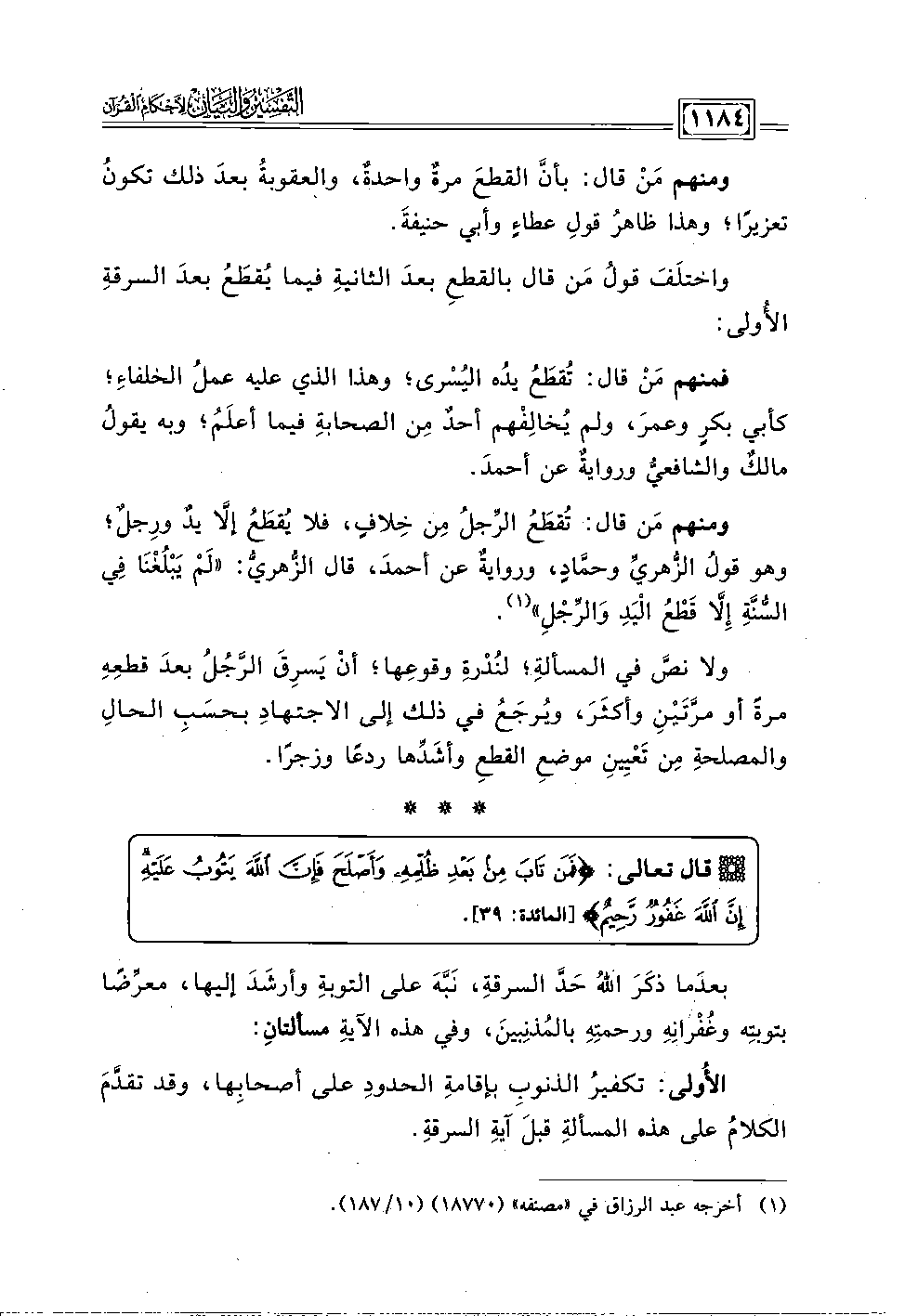 بعدَما ذَكَرَ الله حَدَّ السرقة، نَبَّهَ على التوبةِ وأرشَدَ إليها، معرِّضًا بتوبتِه وغُفْرانِهِ ورحمتِهِ بالمُذنِبينَ، وفي هذه الآيةِ مسألتانِ: