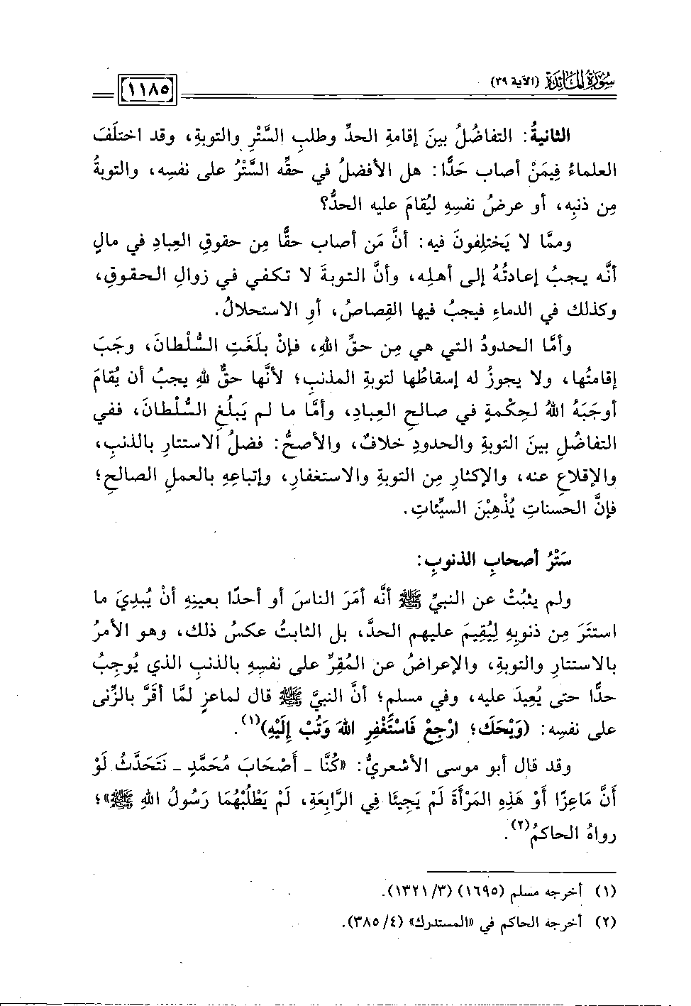 الثانيةُ: التفاضُلُ بينَ إقامةِ الحدِّ وطلبِ السَّتْرِ والتوبة، وقد اختلَفَ العلماءُ فِيمَنْ أصاب حَدًّا: هل الأفضلُ في حقِّه السَّتْرُ على نفسِه، والتوبةُ مِن ذنبِه، أو عرضُ نفسِهِ ليُقامَ عليه الحدُّ؟