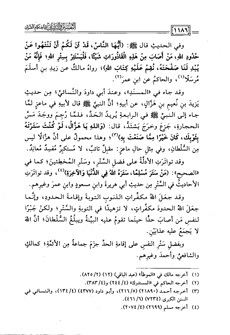 وفي الحديث قال - صلى الله عليه وسلم -: (أيُّهَا النَّاسُ، قَدْ آنَ لَكُمْ أَنْ تَنْتَهُوا عن حُدُودِ الله، مَنْ أَصَابَ مِنْ هَذِهِ الْقَاذُورَاتِ شَيْئًا، فَلْيَسْتَتِرْ بِسِتْرِ الله، فَإِنَّهُ مَنْ يُبْدِ لَنَا صَفْحَتَهُ، نُقِمْ عَلَيْهِ كِتَابَ اللهِ)؛ رواهُ مالكٌ عن زيدِ بنِ أسلَمَ مُرسَلًا (١)، والحاكمُ عن ابنِ عمرَ (٢).