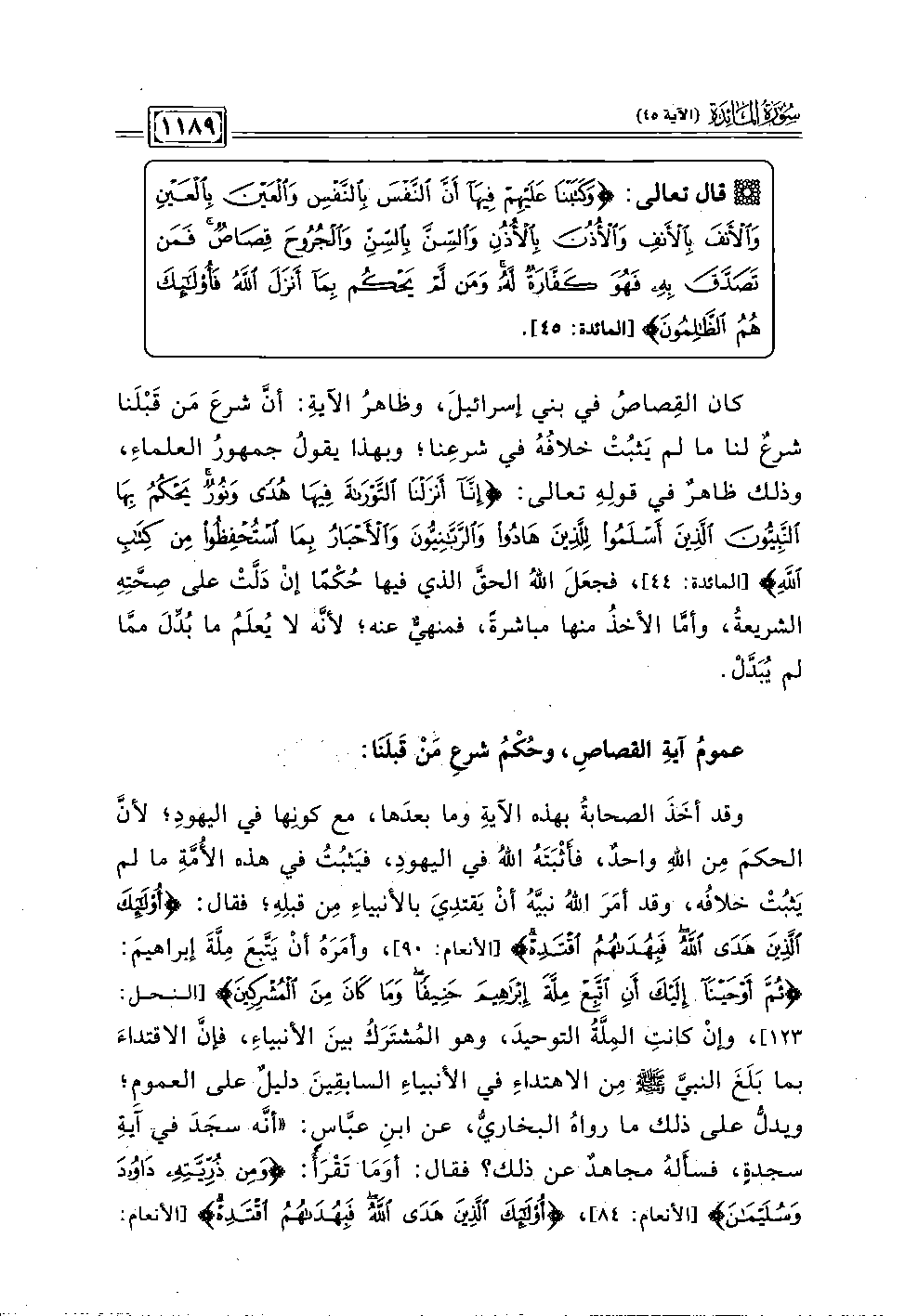 * قال تعالى: {وَكَتَبْنَا عَلَيْهِمْ فِيهَا أَنَّ النَّفْسَ بِالنَّفْسِ وَالْعَيْنَ بِالْعَيْنِ وَالْأَنْفَ بِالْأَنْفِ وَالْأُذُنَ بِالْأُذُنِ وَالسِّنَّ بِالسِّنِّ وَالْجُرُوحَ قِصَاصٌ فَمَنْ تَصَدَّقَ بِهِ فَهُوَ كَفَّارَةٌ لَهُ وَمَنْ لَمْ يَحْكُمْ بِمَا أَنْزَلَ اللَّهُ فَأُولَئِكَ هُمُ الظَّالِمُونَ (٤٥)} [المائدة: ٤٥].