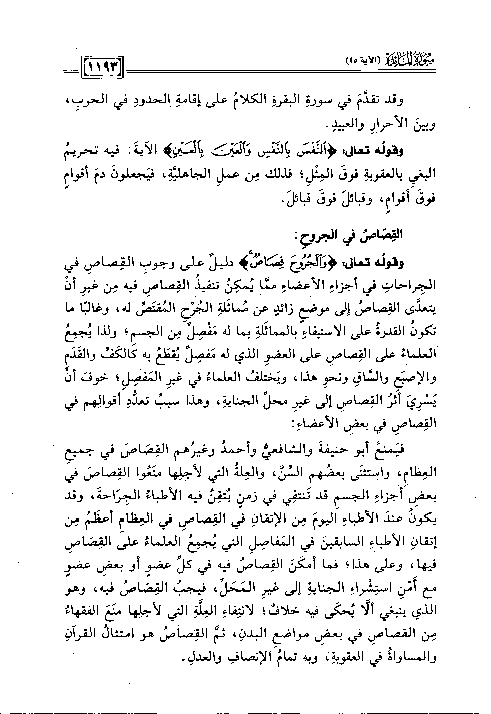 وقوله تعالى، {وَالْجُرُوحَ قِصَاصٌ} دليلَ على وجوبِ القِصاصِ في الجِراحاتِ في أجزاءِ الأعضاءِ مما يُمكِنُ تنفيذ القِصاص فيه مِن غيرِ أنْ يتعدى القِصاص إلى موضع زائد عن مُماثلةِ الجُرحِ المقتَص له، وغالبًا ما تكون القدرةُ على الاستيفاء بالمماثلةِ بما له مَفصِل مِن الجسمِ؛ ولذا يجمِعُ العلماء على القِصاصِ على العضوِ الذي له مَفصِل يُقطَع به كالكف والقَدَم والإصبَع والساقِ ونحوِ هذا، وَيختلفُ العلماء في غيرِ المَفصِلِ؛ خوف أن يَسرِيَ أثر القِصاصِ إلى غيرِ محل الجناية، وهذ سبب تعددِ أقوالِهم في القِصاصِ في بعضِ الأعضاءِ: