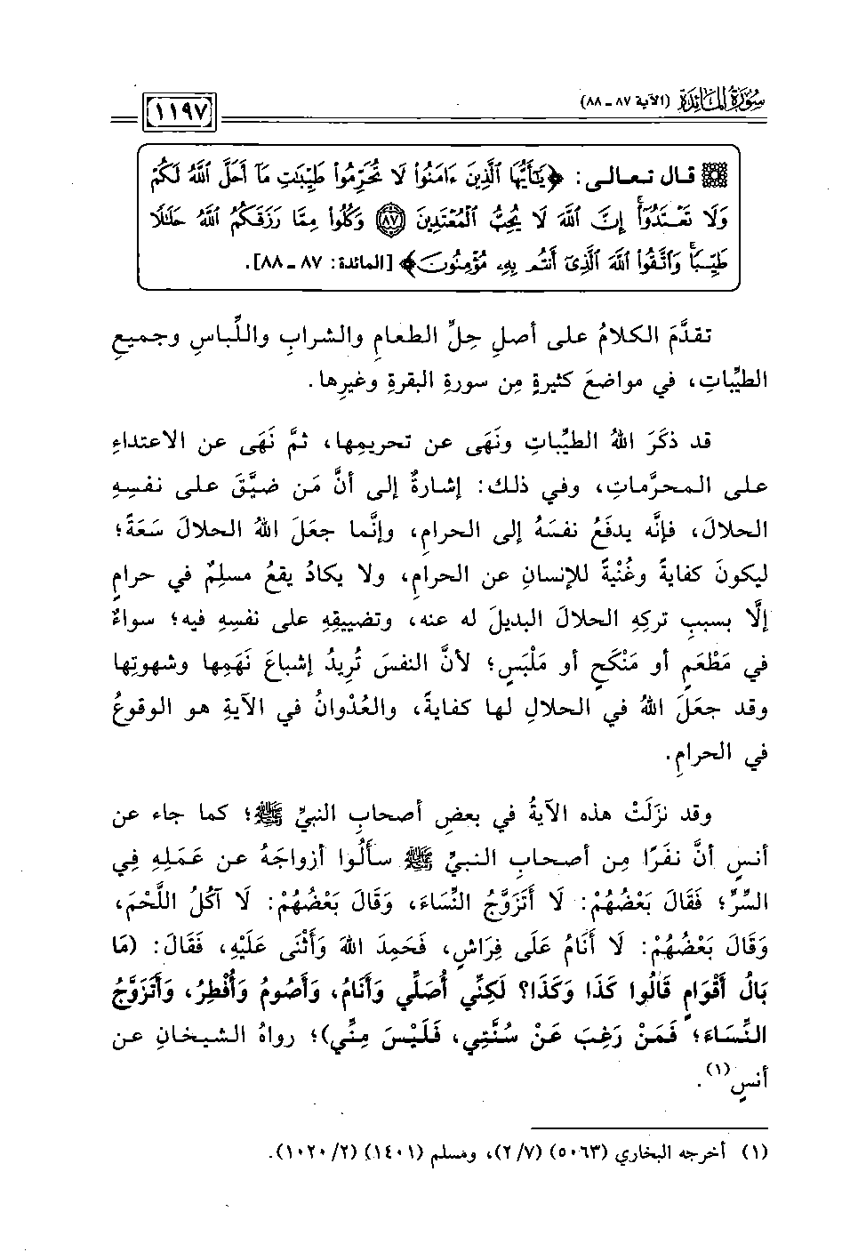 قال تعالى: {يَاأَيُّهَا الَّذِينَ آمَنُوا لَا تُحَرِّمُوا طَيِّبَاتِ مَا أَحَلَّ اللَّهُ لَكُمْ وَلَا تَعْتَدُوا إِنَّ اللَّهَ لَا يُحِبُّ الْمُعْتَدِينَ (٨٧) وَكُلُوا مِمَّا رَزَقَكُمُ اللَّهُ حَلَالًا طَيِّبًا وَاتَّقُوا اللَّهَ الَّذِي أَنْتُمْ بِهِ مُؤْمِنُونَ)} [المائدة: ٨٧ - ٨٨].