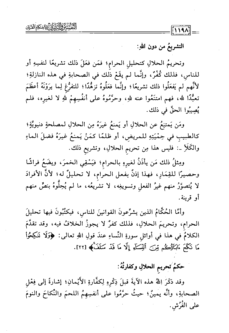 وأمَّا الحُكامُ الذين يشرِّعونَ القوانين للناس، فيكتبونَ فيها تحليلَ الحرام، وتحريمَ الحلال، فذلك كفر لا يجوز الخلاف فيه، وقد تقدمَ الكلامُ في هذا في أوائلِ سورةِ النساءِ عندَ قولِ اللهِ تعالى: {وَلَا تَنْكِحُوا مَا نَكَحَ آبَاؤُكُمْ مِنَ النِّسَاءِ إِلَّا مَا قَدْ سَلَفَ} [٢٢].