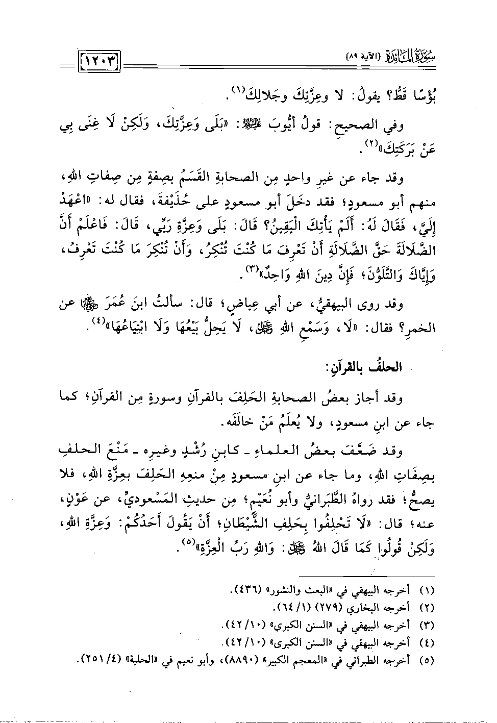 وقد ضَعفَ بعضُ العلماءِ - كابنِ رُشد وغيرِه - مَنعَ الحلفِ بصِفَاتِ الله، وما جاء عن ابنِ مسعودِ مِن منعِهِ الحَلِفَ بعِزةِ الله، فلا يصح؛ فقد رواهُ الطَّبَرانيّ وأبو نُعَيمٍ؛ مِن حديثِ المَسعودي، عن عَوْن، عنه؛ قال: "لَا تَحلِفُوا بِحَلفِ الشَّيطَان؛ أن يَقُولَ أَحَدكُم: وَعِزةِ الله، وَلَكِن قُولُوا كَما قَالَ الله -عز وجل-: وَاللهِ رَبِّ العِزَّةِ" (٥).