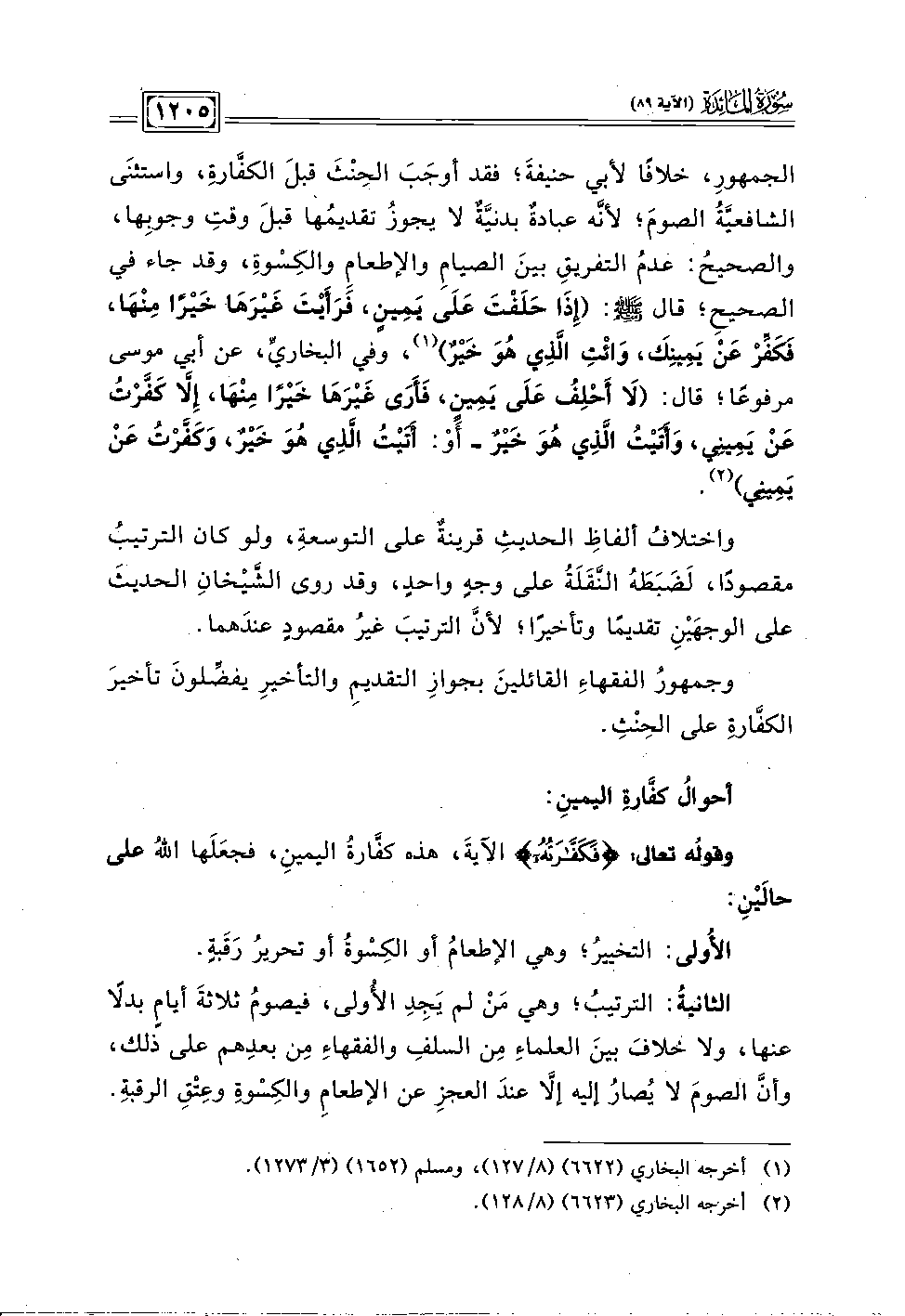 الجمهور، خلافًا لأبي حنيفةَ؛ فقد أوجب الحِنْثَ قبل الكفارة، واستثنى الشافعيةُ الصومَ؛ لأنه عبادة بدنيَّة لا يجوزُ تقديمُها قبلَ وقت وجوبِها، والصحيحُ: عدم التفريقِ بينَ الصيامِ والإطعامِ والكِسوة، وقد جاء في الصحيح؛ قال - صلى الله عليه وسلم -: (إذَا حَلَفتَ عَلَى يَمِين، فَرَأيتَ غيرَهَا خَيرًا مِنْهَا، فكفِّرْ عَنْ يَمِينِكَ، وَائتِ الذي هُوَ خَيرٌ) (١)، وفي البخاريّ، عن أبي موسى مرفوعًا؛ قال: (لَا أَحْلِفُ عَلَى يمِين، فَأرَى غيْرَهَا خَيْرًا مِنْهَا، إِلا كَفرْت عَنْ يَمِيني، وَأتيتُ الَّذِي هُوَ خَير - أَو: أَتَيْت الذي هوَ خَير، وَكَفرتُ عَنْ يَمِيني) (٢).