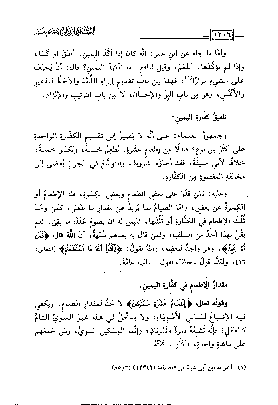 وأمَّا ما جاء عن ابنِ عمرَ: أنه كان إذا أكدَ اليمينَ، أعتَقَ أو كَسَا، وإذا لم يؤكِّدها، أطعَمَ، وقيل لنافعِ: ما تأكيد اليمين؟ قال: أن يَحلِفَ على الشيءِ مرارًا (١)، فهذا مِن بابِ تقديمِ إبراءِ الذمةِ والأحَظِّ للفقيرِ والأنفسِ، وهو مِن بابِ البِر والإحسان، لا مِن بابِ الترتيبِ والإلزام.