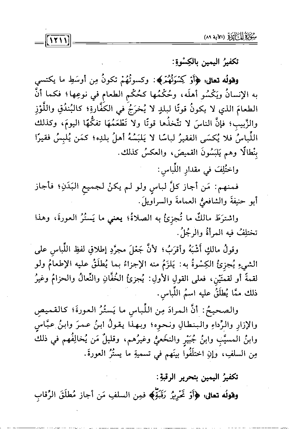 وقوله تعالى: {أَو كِسْوَتُهُمْ}: وكسوتهُم تكون مِن أوسَط ما يكتسي به الإنسان ويَكسُو أهلَه، وحُكمُها كحُكمِ الطعامِ في نوعِها؛ فكما أن الطعامَ الذي لا يكونُ قوتًا لبلدِ لا يُخرَج في الكفارةِ؛ كالبندُقِ واللَّوزِ والزبيبِ؛ فإنَّ الناسَ لا تتخذها قوتًا ولا تطعَمُهَا تفكها اليومَ، وكذلك اللباسُ فلا يُكسَى الفقيرُ لباسًا لا يَلبَسُهُ أهلُ بلدِه؛ كمَن يُلبِسُ فقيرًا بنطالًا وهم يلبَسُونَ القميصَ، والعكسُ كذلك.