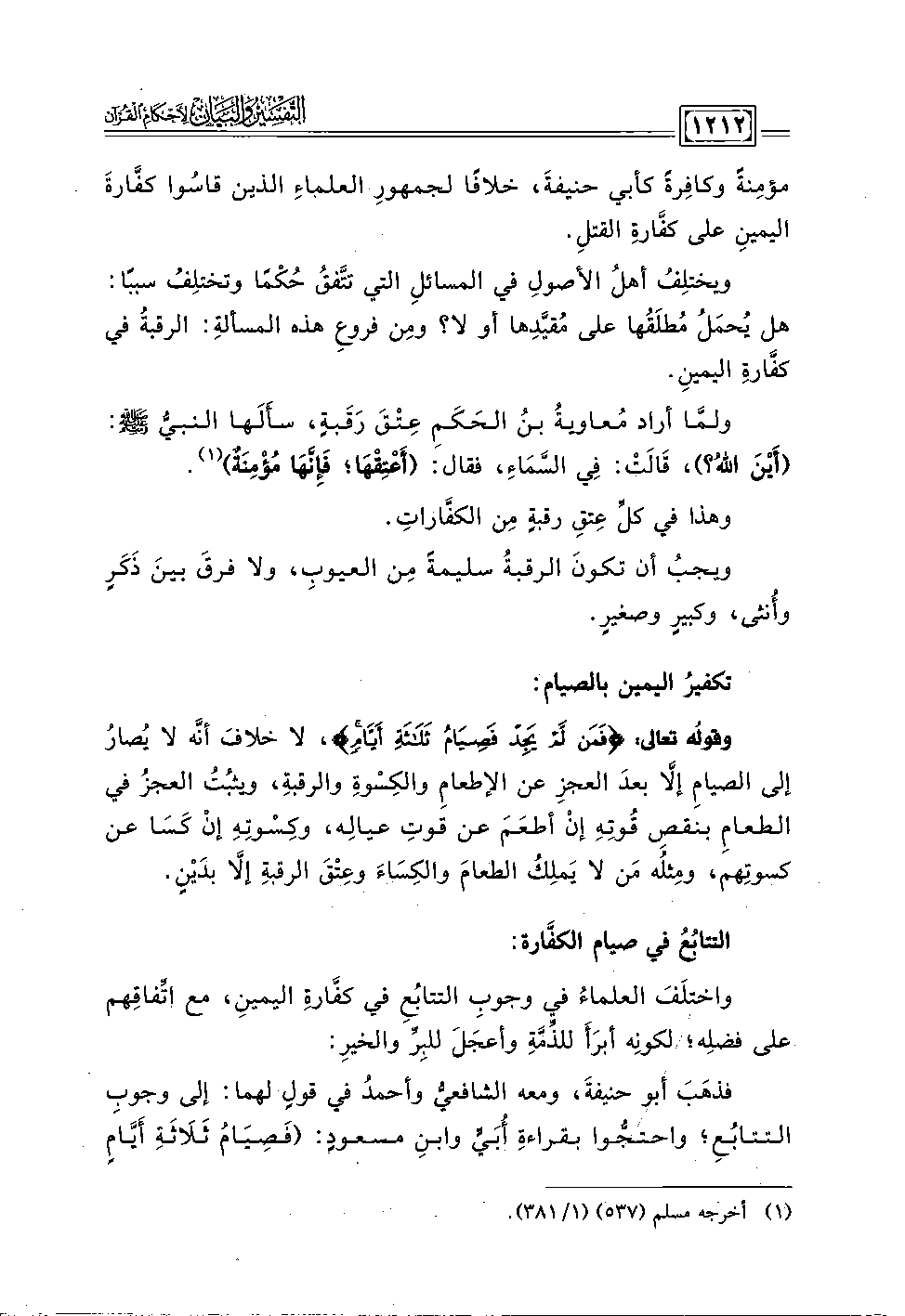 مؤمِنة وكافِرةَ كأبي حنيفةَ، خلافًا لجمهورِ العلماءِ الذين قاسُوا كفَّارةَ اليمينِ على كفَّارة القتلِ.