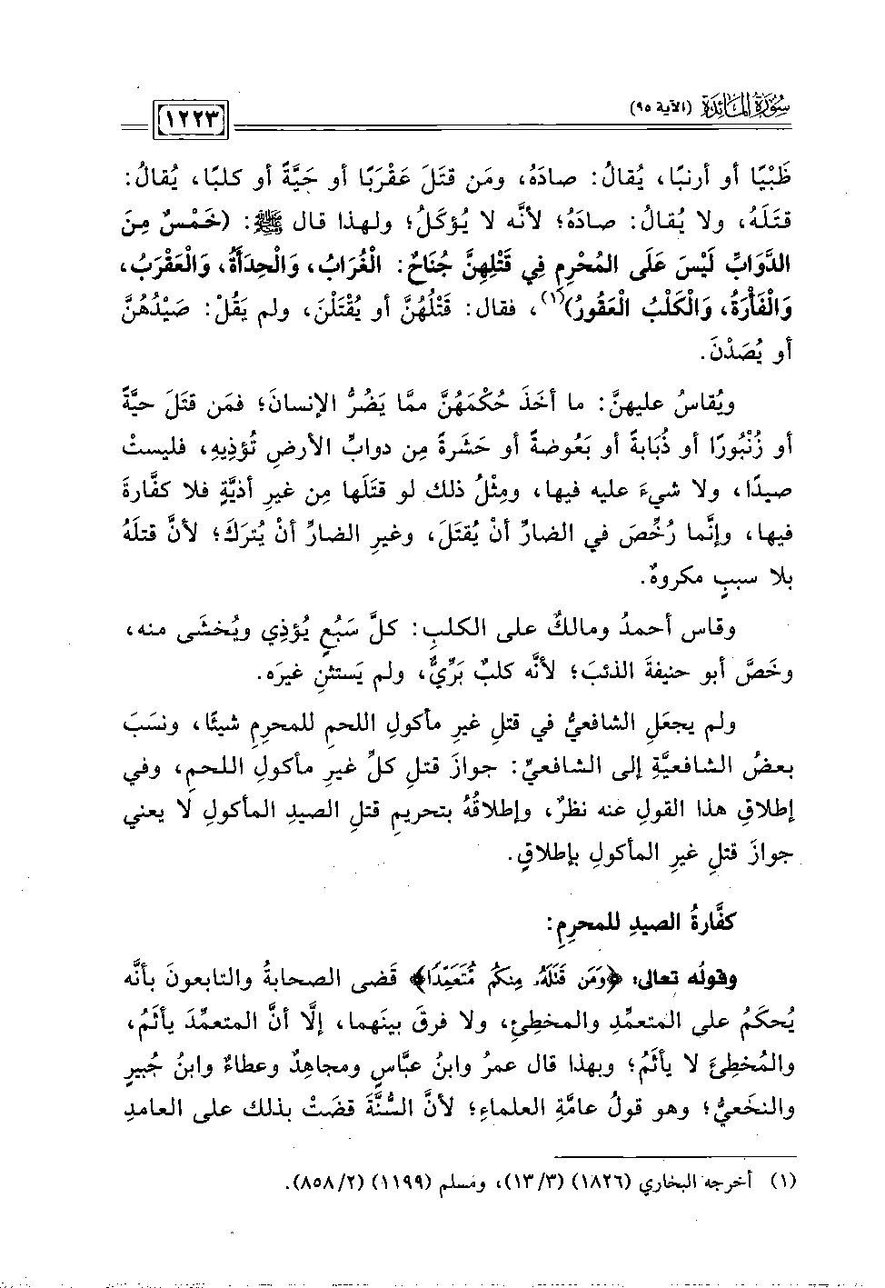 ظَبْيًا أو أرنَبًا، يُقال: صادَهُ، ومَن قتَلَ عَقرَبًا أو حَيَّةً أو كلبًا، يُقالُ: قتَلَهُ، ولا يُقالُ: صادَهُ؛ لأنَّه لا يُؤكَلُ؛ ولهذا قال - صلى الله عليه وسلم -: (خَمْسٌ مِنَ الدَّوَابِّ لَيْسَ عَلَى المُحْرِمِ فِي قَتْلِهِنَّ جُنَاحٌ: الْغُرَابُ، وَالْحِدَأَةُ، وَالْعَقْرَبُ، وَالْفَأْرَةُ، وَالْكَلْبُ الْعَقُورُ) (١)، فقال: قَتْلِهِنَّ أو يُقْتَلْنَ، ولم يَقُلْ: صَيْدُهُنَّ أو يُصَدْنَ.