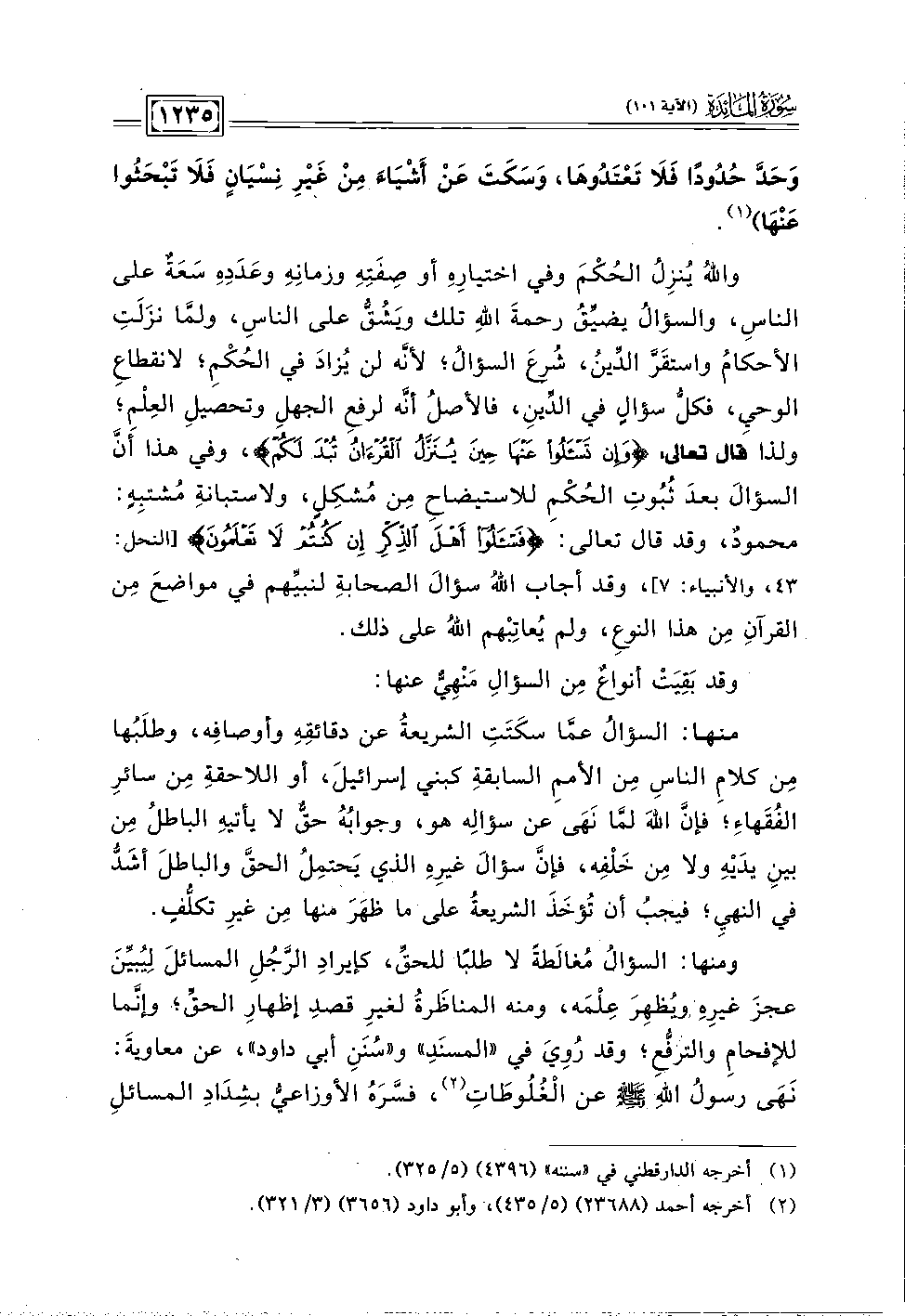 واللهُ يُنزِلُ الحُكمَ وفي اختيارِهِ أو صِفَتِهِ وزمانِهِ وعَدَدِهِ سَعَةٌ على الناس، والسؤالُ يضيَّقُ رحمةَ اللهِ تلك ويَشُقُّ على الناس، ولمَّا نزَلَتِ الأحكامُ واستقَرَّ الدَّينُ، شُرعَ السؤالُ؛ لأنَّه لن يُزادَ في الحُكْمِ؛ لانقطاعِ الوحي، فكلُّ سؤالٍ في الدَّين، فالأصلُ أنه لرفعِ الجهلِ وتحصيلِ العِلْمِ؛ ولذا قال تعالى: {وَإِنْ تَسْأَلُوا عَنْهَا حِينَ يُنَزَّلُ الْقُرْآنُ تُبْدَ لَكُمْ}، وفي هذا أنَّ السؤالَ بعدَ ثُبُوتِ الحُكْمِ للاستيضاحِ مِن مُشكِلٍ، ولاستبانةِ مُستبِهِ: محمودٌ، وقد قال تعالى: {فَاسْأَلُوا أَهْلَ الذِّكْرِ إِنْ كُنْتُمْ لَا تَعْلَمُونَ} [النحل: ٤٣، والأنبياء: ٧]، وقد أجاب اللهُ سؤالَ الصحابةِ لنبيِّهم في مواضعَ مِن القرآنِ مِن هذا النوع، ولم يُعاتِبْهم اللهُ على ذلك.