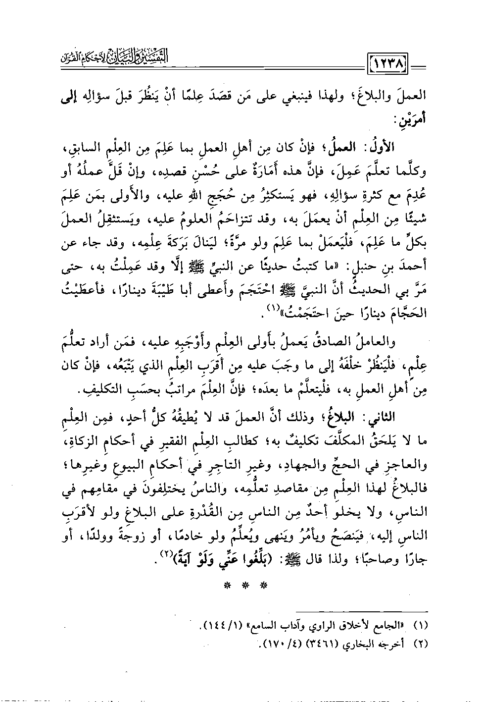 الثاني: البلاغُ؛ وذلك أنَّ العملَ قد لا يُطيقُهُ كلُّ أحدٍ، فمِن العِلْمِ ما لا يَلحَقُ المكلَّفَ تكليفٌ به؛ كطالبِ العِلْمِ الفقيرِ في أحكامِ الزكاةِ، والعاجزِ في الحجِّ والجهاد، وغيرِ التاجِرِ في أحكامِ البيوعِ وغيرِها؛ فالبلاغُ لهذا العِلْمِ مِن مقاصدِ تعلُّمِه، والناسُ يختلِفونَ في مقامِهم في الناسِ، ولا يخلو أحدٌ الناسِ مِن القُدْرةِ على البلاغِ ولو لأقرَبِ الناسِ إليه، فيَنصَحُ ويأمُرُ ويَنهى ويُعلِّمُ ولو خادمًا، أو زوجةً وولدًا، أو جارًا وصاحبًا؛ ولذا قال - صلى الله عليه وسلم -: (بَلِّغُوا عَنِّي وَلَوْ آيَةً) (٢).