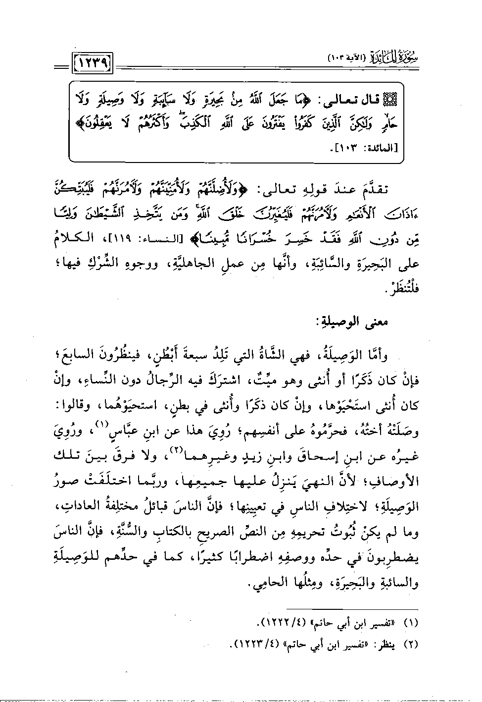 وأمَّا الوَصِيلَةُ، فهي الشَّاةُ التي تَلِدُ سبعةَ أَبْطُنٍ، فينظُرُونَ السابعَ؛ فإنْ كان ذَكَرًا أو أُنثى وهو ميِّتٌ، اشترَكَ فيه الرَّجالُ دون النِّساء، وإنْ كان أُنثى استَحْيَوْها، وإنْ كان ذكَرًا وأُنثى في بطنٍ، استحيَوْهُما، وقالوا: وصَلَتْهُ أختُهُ، فحرَّمُوهُ على أنفسِهم؛ رُوِيَ هذا عن ابنِ عبَّاسٍ (١)، ورُوِيَ غيرُه عن ابنِ إسحاقَ وابنِ زيدٍ وغيرِهما (٢)، ولا فرقَ بينَ تلك الأوصافِ؛ لأنَّ النهيَ يَنزِلُ عليها جميعِها، وربَّما اختلَفَتْ صورُ الوَصِيلَةِ؛ لاختِلافِ الناسِ في تعيِينِها؛ فإنَّ الناسَ قبائلُ مختلِفةُ العادات، وما لم يكنْ ثُبُوتُ تحريمِهِ مِن النصَّ الصريحِ بالكتابِ والسُّنَّة، فإنَّ الناسَ يضطرِبونَ في حدِّه ووصفِهِ اضطرابًا كثيرًا، كما في حدِّهم للوَصِيلَةِ والسائبةِ والبَحِيرَة، ومِثلُها الحامِي.