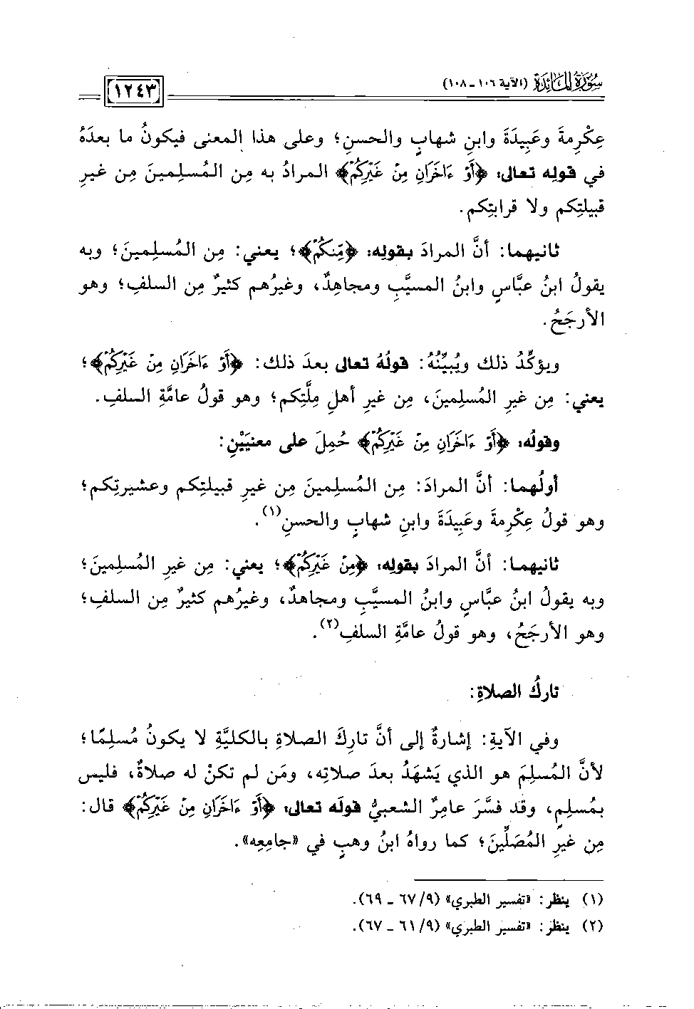 وفي الآيةِ: إشارةٌ إلى أنَّ تارِكَ الصلاةِ بالكليَّةِ لا يكونُ مُسلِمًا؛ لأنَّ المُسلِمَ هو الذي يَشهَدُ بعدَ صلاتِه، ومَن لم تكنْ له صلاةٌ، فليس بمُسلِمٍ، وقد فسَّرَ عامِرٌ الشعبيُّ قولَه تعالى: {أَو آخَرَانِ مِنْ غَيْرِكُمْ} قال: مِن غيرِ المُصَلينَ، كما رواهُ ابنُ وهبٍ في "جامِعِه".