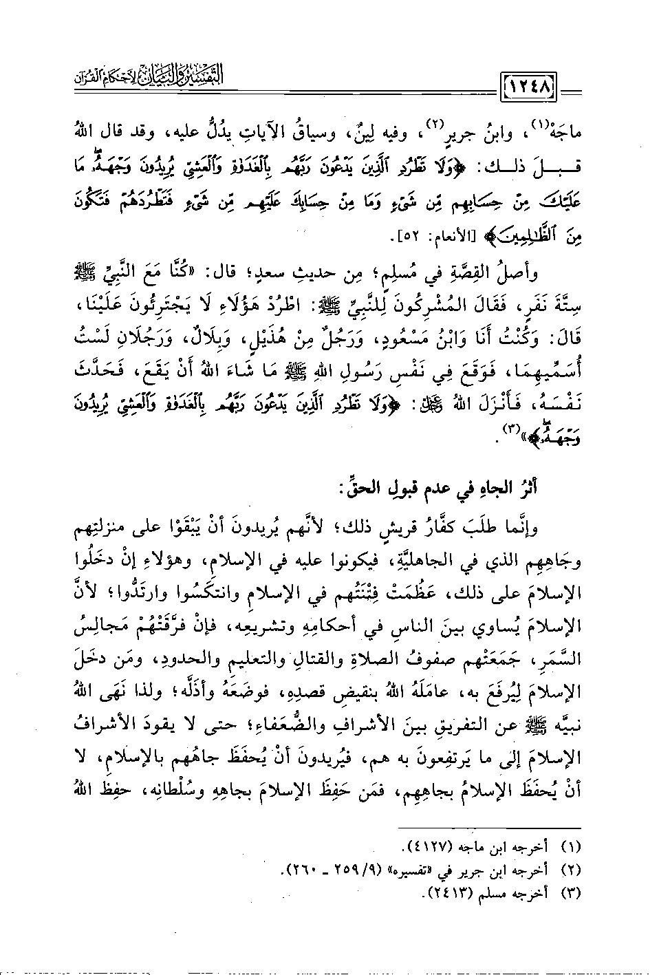 ماجَهْ (١)، وابنُ جريرٍ (٢)، وفيه لِينٌ، وسياقُ الآياتِ يدُلُّ عليه، وقد قال اللهُ قبلَ ذلك: {وَلَا تَطْرُدِ الَّذِينَ يَدْعُونَ رَبَّهُمْ بِالْغَدَاةِ وَالْعَشِيِّ يُرِيدُونَ وَجْهَهُ مَا عَلَيْكَ مِنْ حِسَابِهِمْ مِنْ شَيْءٍ وَمَا مِنْ حِسَابِكَ عَلَيْهِمْ مِنْ شَيْءٍ فَتَطْرُدَهُمْ فَتَكُونَ مِنَ الظَّالِمِينَ (٥٢)} [الأنعام: ٥٢].