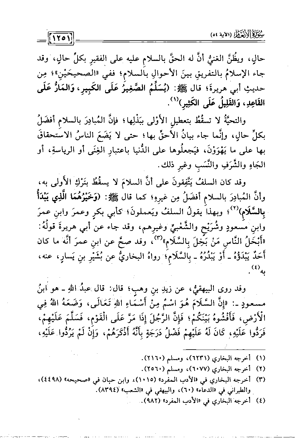 وقد كان السلفُ يَتَّفِقونَ على أنَّ السلامَ لا يسقُطُ بتَرْكِ الأَولى به، وأنَّ المُبادِرَ بالسلامِ أفضَلُ مِن غيرِهِ؛ كما قال - صلى الله عليه وسلم -: (وَخَيْرُهُمَا الَّذِي يَبْدَأُ بِالسَّلَامِ) (٢)؛ وبهذا يقولُ السلفُ ويَعملونَ؛ كأبي بكرٍ وعمرَ وابنِ عمرَ وابنِ مسعودٍ وشُرَيْحٍ والشَّعْبيِّ وغيرِهم، وقد جاء عن أبي هريرةَ قولُهُ: "أَبْخَلُ النَّاسِ مَنْ بَخِلَ بِالسَّلَامِ" (٣)، وقد صحَّ عن ابنِ عمرَ أنه ما كان أَحَدٌ يَبْدَؤُهُ -أَو يَبْدُرُهُ- بِالسَّلَامِ؛ رواهُ البخاريُّ عن بُشَيْرِ بنِ يَسارٍ، عنه، به (٤).