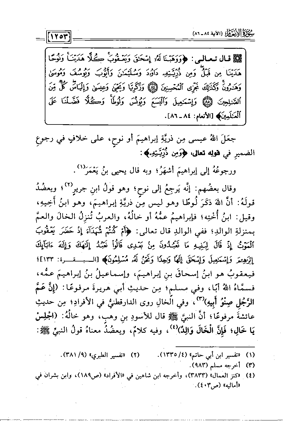 وقال بعضُهم: إنَّه يَرجِعُ إلى نوحٍ؛ وهو قولُ ابنِ جريرٍ (٢)؛ ويعضُدُ قولَهُ: أنَّ اللهَ ذكَرَ لُوطًا وهو ليس مِن ذريَّةِ إبراهيمَ، وهو ابنُ أَخِيه، وقيل: ابنُ أُختِه؛ فإبراهيمُ عمُّهُ أو خالُهُ، والعربُ تُنزِلُ الخالَ والعمَّ بمنزلةِ الوالدِ؛ ففي الوالدِ قال تعالى: {أَمْ كُنْتُمْ شُهَدَاءَ إِذْ حَضَرَ يَعْقُوبَ الْمَوْتُ إِذْ قَالَ لِبَنِيهِ مَا تَعْبُدُونَ مِنْ بَعْدِي قَالُوا نَعْبُدُ إِلَهَكَ وَإِلَهَ آبَائِكَ إِبْرَاهِيمَ وَإِسْمَاعِيلَ وَإِسْحَاقَ إِلَهًا وَاحِدًا وَنَحْنُ لَهُ مُسْلِمُونَ} [البقرة: ١٣٣]؛ فيعقوبُ هو ابنُ إسحاقَ بنِ إبراهيمَ، وإسماعيلُ بن إبراهيمَ عمُّه، فسمَّاهُ اللهُ أبًا، وفي مسلمٍ؛ مِن حديثِ أبي هريرةَ مرفوعًا: (إِنَّ عَمَّ الرَّجُلِ صِنوُ أَبِيهِ) (٣)، وفي الخالِ روى الدارقطنيُّ في الأفرادِ؛ مِن حديثِ عائشةَ مرفوعًا؛ أنَّ النبيَّ - صلى الله عليه وسلم - قال للأسودِ بنِ وهبٍ، وهو خالُهُ: (اجْلِسْ يَا خَالِ؛ فَإِنَّ الْخَالَ وَالِدٌ) (٤)، وفيه كلامٌ، ويعضُدُ معناهُ قولُ النبيِّ - صلى الله عليه وسلم -: