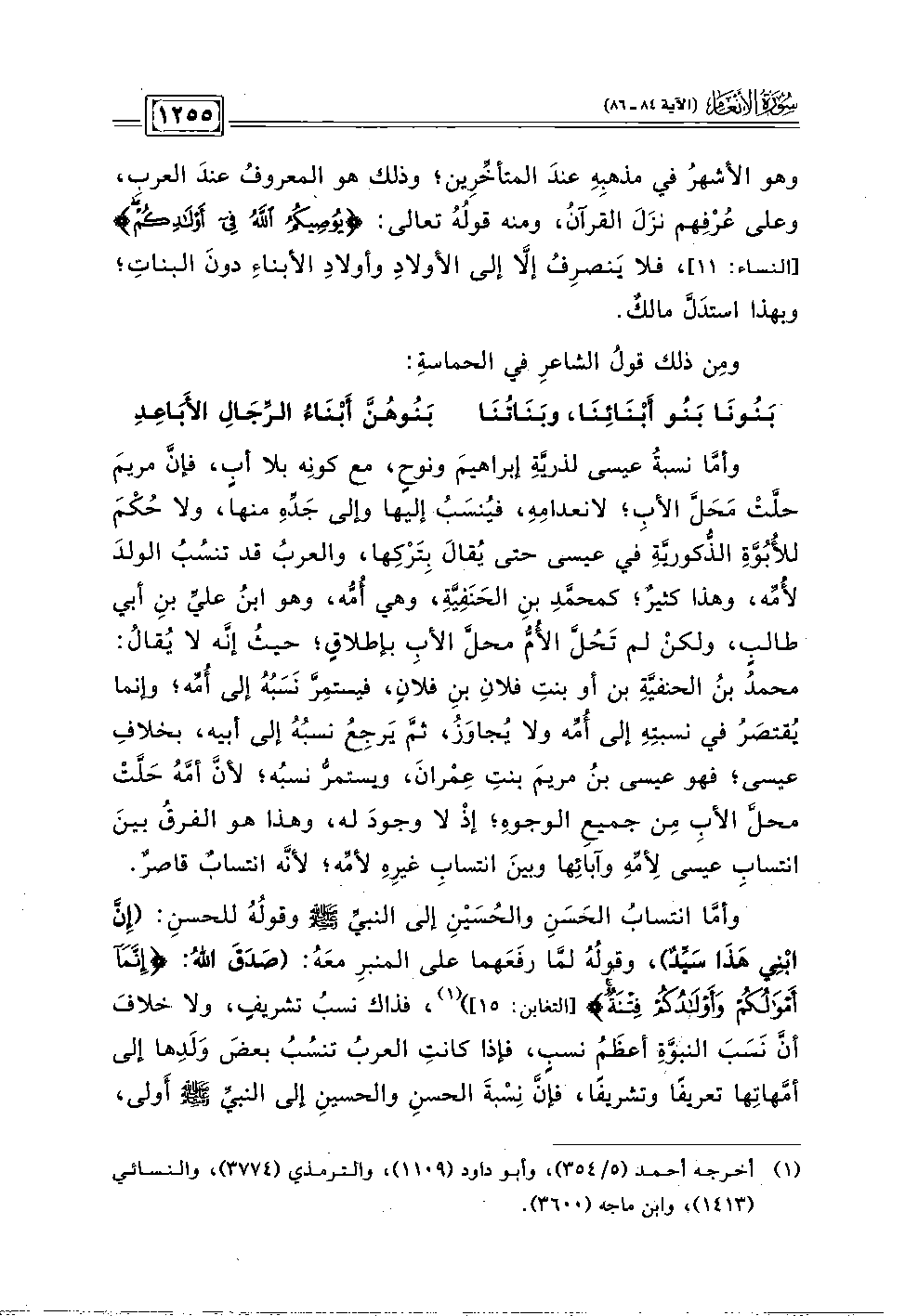وأمَّا انتسابُ الحَسَنِ والحُسَيْنِ إلى النبيِّ - صلى الله عليه وسلم - وقولُهُ للحسنِ: (إِنَّ ابْنِي هَذَا سَيِّدٌ)، وقولُهُ لمَّا رفَعَهما على المنبرِ معَهُ: (صَدَقَ اللهُ: {إِنَّمَا أَمْوَالُكُمْ وَأَوْلَادُكُمْ فِتْنَةٌ} [التغابن: ١٥] (١)، فذاك نسبُ تشريفٍ، ولا خلافَ أنَّ نَسَبَ النبوَّةِ أعظَمُ نسبٍ، فإذا كانتِ العربُ تنسُبُ بعضَ وَلَدِها إلى أمَّهاتِها تعريفًا وتشريفًا، فإنَّ نِسْبةَ الحسنِ والحسينِ إلى النبيِّ - صلى الله عليه وسلم - أولى،