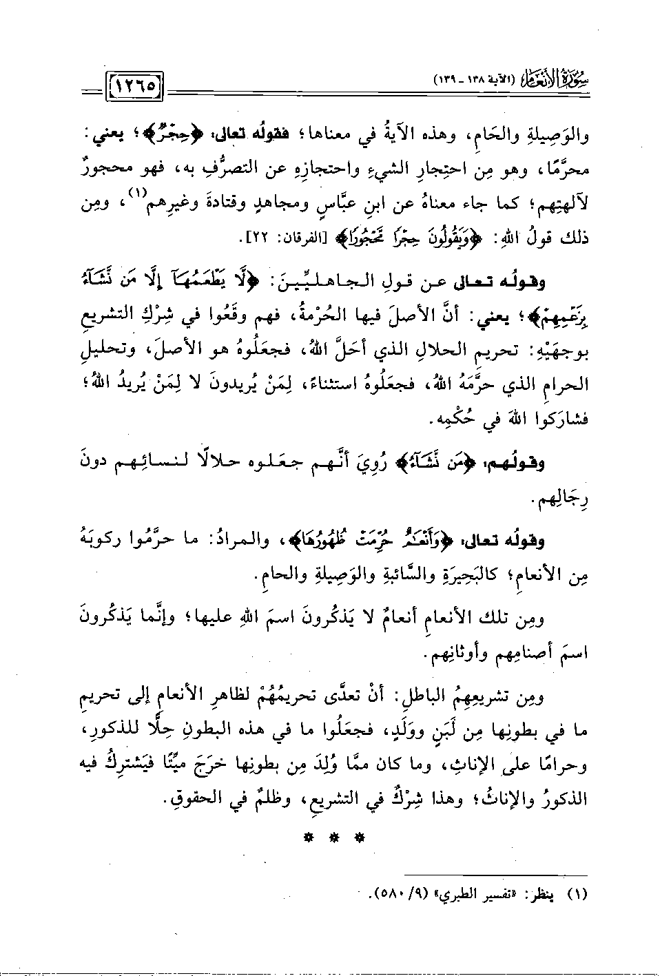 والوَصِيلةِ والحَام، وهذه الآيةُ في معناها؛ فقولُه تعالى، {حِجْرٌ}؛ يعني: محرَّمًا، وهو مِن احتِجارِ الشيءِ واحتجازِهِ عن التصرُّفِ به، فهو محجورٌ لآلهتِهم؛ كما جاء معناهُ عن ابنِ عبَّاسٍ ومجاهدٍ وقتادةَ وغيرِهم (١)، ومِن ذلك قولُ اللهِ: {وَيَقُولُونَ حِجْرًا مَحْجُورًا} [الفرقان: ٢٢].