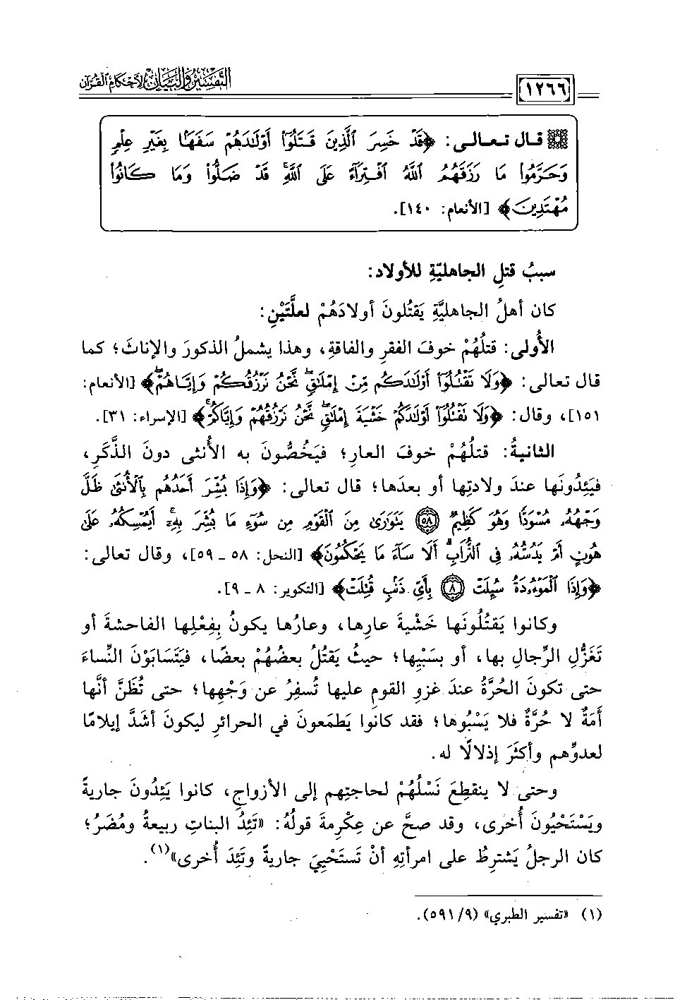 كان أهلُ الجاهليَّةِ يَقتُلونَ أولادَهُمْ لعلَّتَيْنِ: