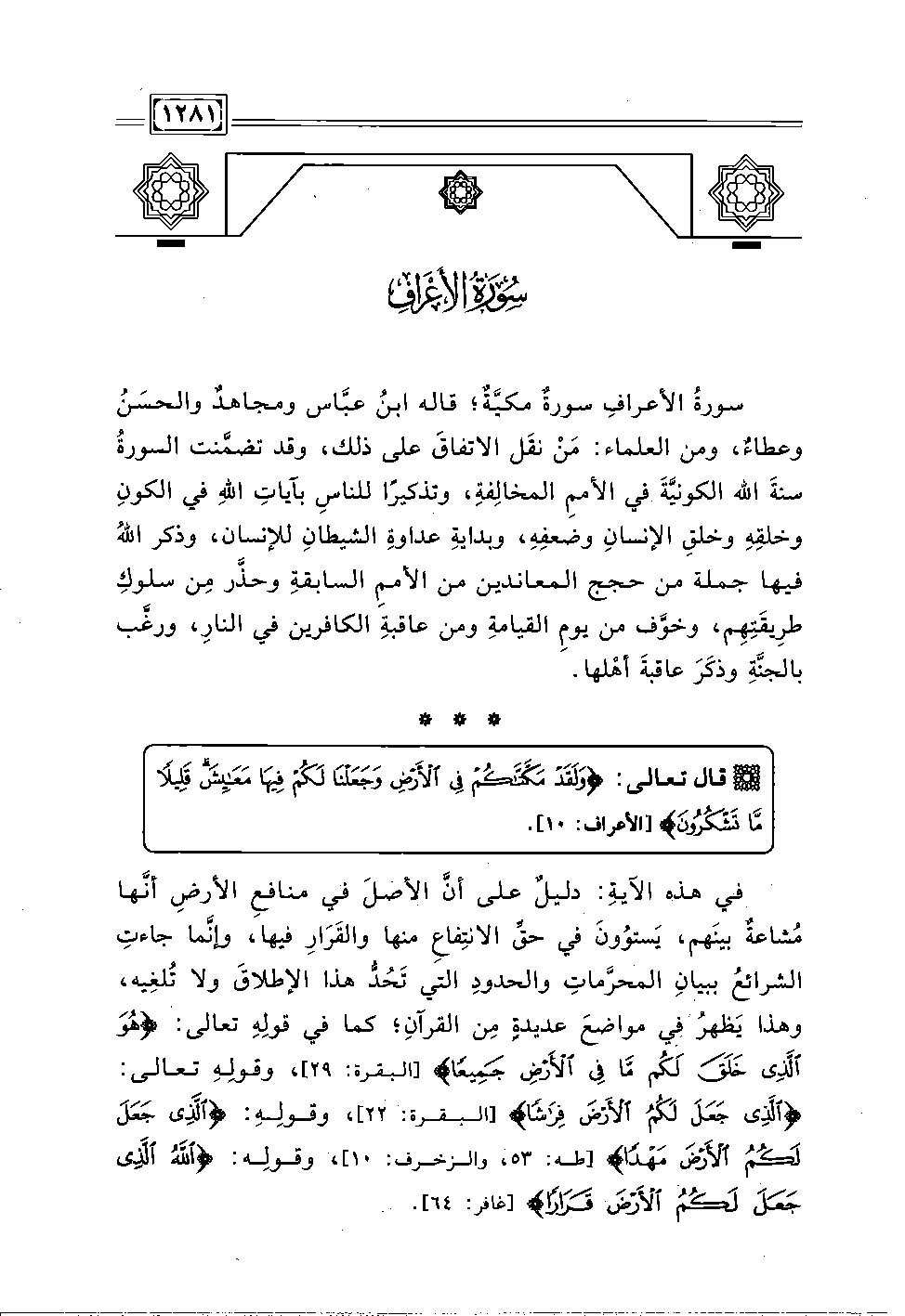 سورةُ الأَعْرَافِ سورةٌ مكيَّةٌ؛ قاله ابنُ عبَّاس ومجاهدٌ والحسَنُ وعطاءٌ، ومن العلماء: مَنْ نقَل الاتفاقَ على ذلك، وقد تضمَّنت السورةُ سنةَ الله الكونيَّةَ في الأممِ المخالِفة، وتذكيرًا للناسِ بآياتِ اللهِ في الكونِ وخلقِهِ وخلقِ الإنسانِ وضعفِه، وبدايةِ عداوةِ الشيطانِ للإنسان، وذكر اللهُ فيها جملة من حجج المعاندين من الأممِ السابقةِ وحذَّر مِن سلوكِ طرِيقَتِهِم، وخوَّف من يومِ القيامةِ ومن عاقبةِ الكافرين في النار، ورغَّب بالجنَّةِ وذكَرَ عاقبةَ أهْلها.