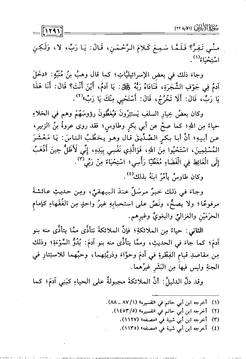 وكان بعضُ خِيارِ السلفِ يَستتِرُونَ فيُغطُّونَ رؤوسَهُمْ وهم في الخلاءِ حياءً مِن اللهِ؛ كما صحَّ عن أبي بكرٍ وطاوسٍ، فقد روى عروةُ بن الزبير، عن أبيه، أنَّ أبا بكرٍ الصِّدِّيقَ قال وهو يخطُبُ الناسَ: يَا مَعْشَرَ المُسْلِمِينَ، اسْتَحْيُوا مِنَ الله، فَوَالَّذِي نَفسِي بِيَدِه، إِنِّي لَأظَلُّ حِينَ أَذْهَبُ إِلَى الْغَائِطِ فِي الْفَضَاءِ مُغَطِّيًا رَأْسِي؛ اسْتِحْيَاءً مِنْ رَبِّي (٣).