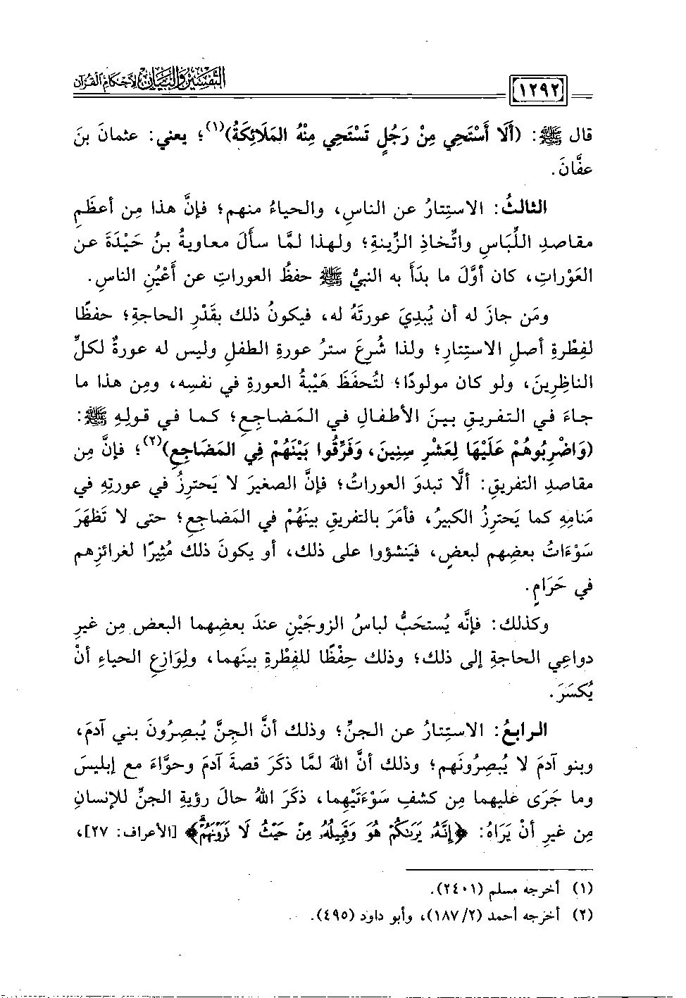 ومَن حازَ له أن يُبدِيَ عورتَهُ له، فيكونُ ذلك بقَدْرِ الحاجةِ؛ حفظًا لفِطْرةِ أصلِ الاستِتارِ؛ ولذا شُرعَ سترُ عورةِ الطفلِ وليس له عورةٌ لكلِّ الناظِرِينَ، ولو كان مولودًا، لتُحفَظَ هَيْبةُ العورةِ في نفسِه، ومِن هذا ما جاءَ في التفريقِ بينَ الأطفالِ في المَضاجِعِ؛ كما في قولهِ - صلى الله عليه وسلم -: (وَاضْرِبُوهُمْ عَلَيْهَا لِعَشْرِ سِنِينَ، وَفَرِّقُوا بَيْنَهُمْ فِي الْمَضَاجِعِ) (٢)؛ فإنَّ مِن مقاصدِ التفريقِ: ألَّا تبدوَ العوراتُ؛ فإنَّ الصغيرَ لا يَحترِزُ في عورتِهِ في مَنامِهِ كما يَحترِزُ الكبيرُ، فأمَرَ بالتفريقِ بينَهمْ في المَضاجِعِ حتى لا تَظهَرَ سَوْءَاتُ بعضِهم لبعضٍ، فيَنشؤوا على ذلك، أو يكونَ ذلك مُثيرًا لغرائزِهم في حَرَامٍ.