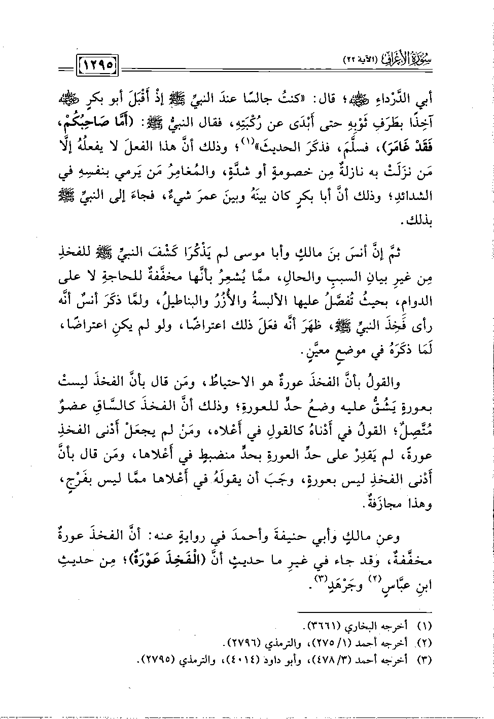 ثم إنَّ أنسَ بنَ مالكٍ وأبا موسى لم يَذْكُرَا كَشْفَ النبيِّ - صلى الله عليه وسلم - للفخذِ مِن غيرِ بِيانِ السببِ والحال، ممَّا يُشعِرُ بأنَّها مخفَّفةٌ للحاجةِ لا على الدوام، بحيثُ تُفصَّلُ عليها الألبسةُ والأزُرُ والبناطيلُ، ولمَّا ذكَرَ أنسٌ أنه رأى فَخِذَ النبيِّ - صلى الله عليه وسلم -، ظهَرَ أنه فعَلَ ذلك اعتراضًا، ولو لم يكنِ اعتراضًا، لَمَا ذكَرَهُ في موضعٍ معيَّنٍ.