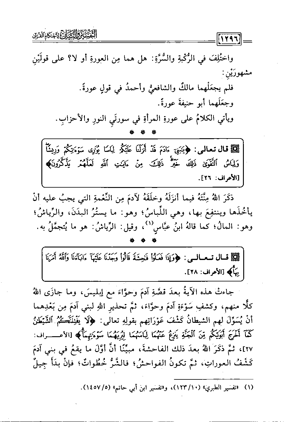 ويأتي الكلامُ على عورةِ المرأةِ في سورتَيِ النورِ والأحزابِ.
