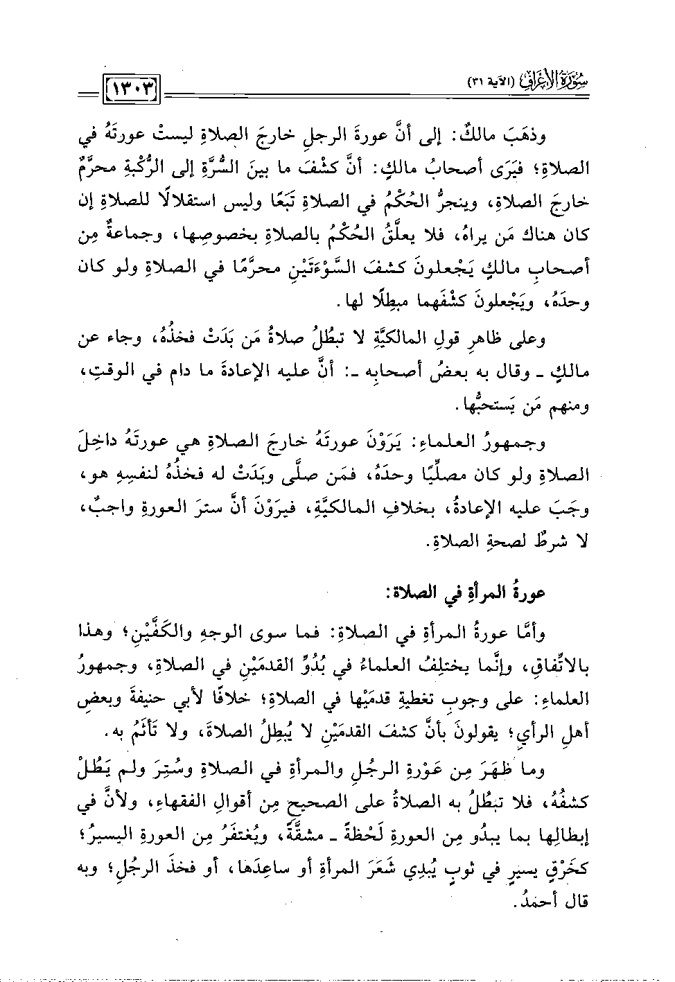 وذهَبَ مالكٌ إلى أنَّ عورةَ الرجلِ خارجَ الصلاةِ ليستْ عورتَهُ في الصلاةِ؛ فيَرَى أصحابُ مالكٍ: أنَّ كشفَ ما بينَ السُّرَّةِ إلى الرُّكْبةِ محرَّمٌ خارجَ الصلاة، وينجرُّ الحُكْمُ في الصلاةِ تَبَعًا وليس استقلالًا للصلاةِ إن كان هناك مَن يراهُ، فلا يعلَّقُ الحُكْمُ بالصلاةِ بخصوصِها، وجماعةٌ مِن أصحابِ مالكٍ يَجْعَلونَ كشفَ السَّوْءَتَينِ محرَّمًا في الصلاةِ ولو كان وحدَهُ، ويَجْعلونَ كشْفَهما مبطِلًا لها.