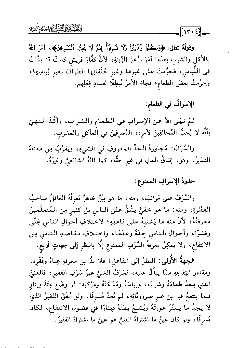والسَّرَفُ على مَراتبَ، ومنه: ما هو بيِّنٌ ظاهرٌ يَعرِفُهُ العاقلُ صاحبُ الفِطْرةِ، ومنه: ما هو خفيٌّ يشُقُّ على الناسِ دل كثيرٍ من المُتعلِّمينَ معرفتُهُ؛ لأنَّ منه ما يشتبِهُ على فاعلِهِ؛ لاختلافِ أحوالِ الناسِ غِنًى وفقرًا، وأحوالِ الناسِ جِدَةٍ وعدَمًا، واختلافِ مقاصدِ الناسِ مِن الانتفاع، ولا يمكِن معرِفةُ السَّرَفِ المصنوع إلَّا بالنظرِ إلى جهات أربعٍ: