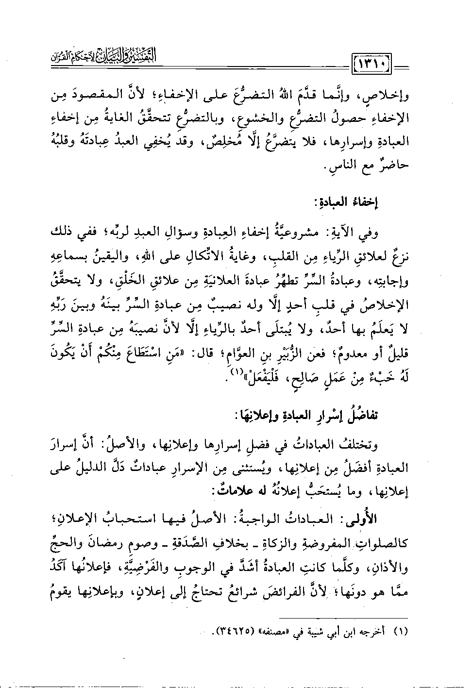 وتختلفُ العباداتُ في فضلِ إسرارِها وإعلانِها، والأصلُ: أنَّ إسرارَ العبادةِ أفضَلُ مِن إعلانِها، ويُستثنى مِن الأسرارِ عباداتٌ دَلَّ الدليلُ على إعلانِها، وما يُستحبُّ إعلانُهُ له علاماتٌ: