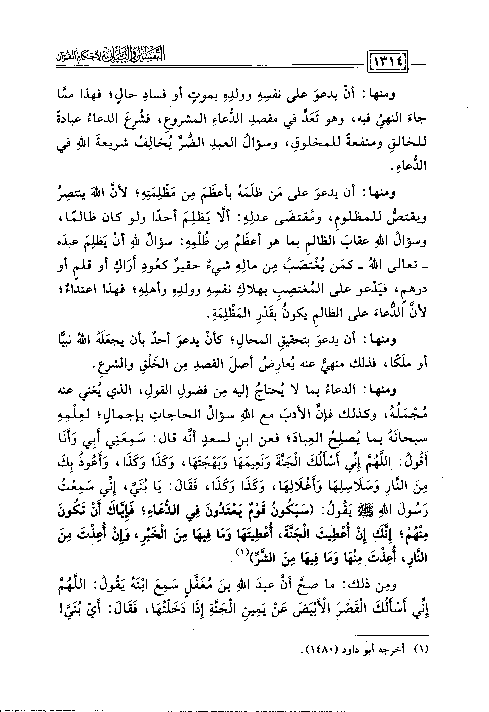 ومنها: الدعاءُ بما لا يُحتاجُ إليه مِن فضولِ القولِ، الذي يُغني عنه مُجمَلُهُ، وكذلك فإنَّ الأدبَ مع اللهِ سؤالُ الحاجاتِ بإجمالٍ؛ لعلمِهِ سبحانَهُ بما يُصلِحُ العِبادَ؛ فعن ابنِ لسعدٍ أنه قال: سَمِعَنِي أبِي وَأنَا أَقُولُ: اللَّهُمَّ إِنِّي أَسْألُكَ الجَنَّةَ وَنَعِيمَهَا وَبَهجَتَهَا، وَكَذَا وَكَذَا، وَأَعُوذُ بِكَ مِنَ النَّارِ وَسَلَاسِلِهَا وَأَغلَالِهَا، وَكَذَا وَكَذَا، فَقَالَ: يَا بُنَيَّ، إِنِّي سَمِعْتُ رَسُولَ اللهِ - صلى الله عليه وسلم - يَقُولُ: (سَيَكُون قَوْمٌ يعتَدُونَ فِي الدُّعَاءِ؛ فَإياكَ أَن تَكُونَ مِنهُمْ؛ إنَّكَ إِن أعْطِيتَ الْجَنَّةَ، أُعطِيتَهَا وَمَا فِيهَا مِنَ الْخيْرِ، وَإنْ أُعِذْتَ مِنَ النَّار، أعَذْتَ مِنْهَا وَمَا فِيهَا مِنَ الشَّرِّ) (١).