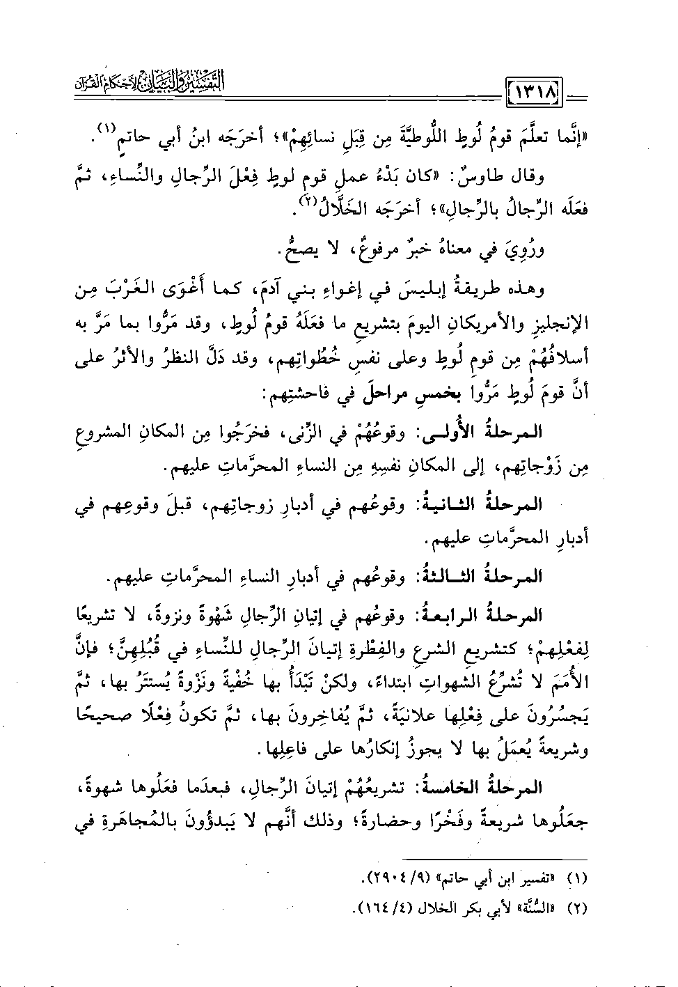 المرحلة الرابعة: وقوعهم في إتيانِ الرِّجالِ شَهوةً ونزوةً، لا تشريعًا لِفعلِهم؛ كتشريعِ الشرعِ والفِطرةِ إتيانَ الرِّجالِ للنساءِ في قُبُلِهِنَّ؛ فإنَّ الأُمَمَ لا تُشرِّعُ الشهواتِ ابتداءً، ولكنْ تَبْدَأُ بها خُفيةٌ ونَزوةً يُستتَرُ بها، ثم يَجسُرُونَ على فِعلِها علانيَةً، ثم يُفاخِرونَ بها، ثم تكونُ فِعْلًا صحيحًا وشريعةً يُعمَلُ بها لا يجوزُ إنكارُها على فاعِلِها.