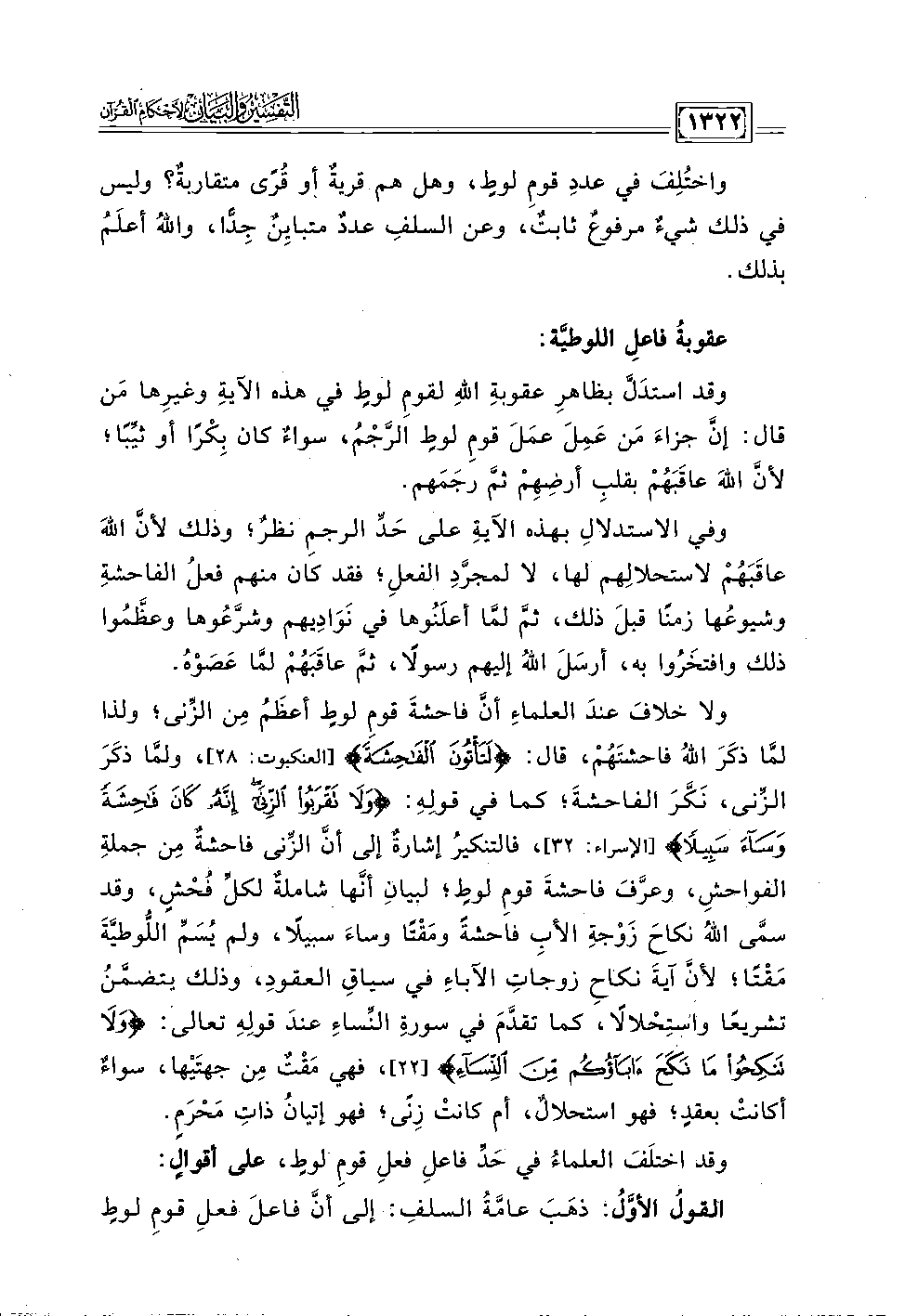 ولا خلافَ عندَ العلماءِ أنَّ فاحشةَ قومِ لوطٍ أعظَمُ مِن الزِّنى؛ ولذا لمَّا ذكَرَ اللهُ فاحشتَهُمْ، قال: {لَتَأْتُونَ الْفَاحِشَةَ} [العنكبوت: ٢٨]، ولمَّا ذكَرَ الزِّنى، نَكَّرَ الفاحشةَ؛ كما في قولِهِ: {وَلَا تَقْرَبُوا الزِّنَا إِنَّهُ كَانَ فَاحِشَةً وَسَاءَ سَبِيلًا} [الإسراء: ٣٢]، فالتنكيرُ إشارةٌ إلى أنَّ الزِّنى فاحشةٌ مِن جملةِ الفواحش، وعرَّفَ فاحشةَ قومِ لوطٍ؛ لبيانِ أنَّها شاملةٌ لكلِّ فُحشٍ، وقد سمَّى الله نكاحَ زَوْجهِ الأبِ فاحشةً ومَقْتًا وساءَ سبيلًا، ولم يُسَمِّ اللُّوطيَّةَ مَقتًا؛ لأنَّ آيةَ نكاحِ زوجاتِ الآباءِ في سياقِ العقود، وذلك يتضمَّنُ تشريعًا واستِحْلالًا، كما تقدَّمَ في سورةِ النِّساءِ عندَ قولِهِ تعالى: {وَلَا تَنْكِحُوا مَا نَكَحَ آبَاؤُكُمْ مِنَ النِّسَاءِ} [النساء: ٢٢]، فهي مَقْتٌ مِن جهتَيْها، سواءٌ أكانتْ بعقدٍ؛ فهو استحلالٌ، أم كانتْ زِنًى؛ فهو إتيانُ ذاتِ مَحْرَمٍ.
